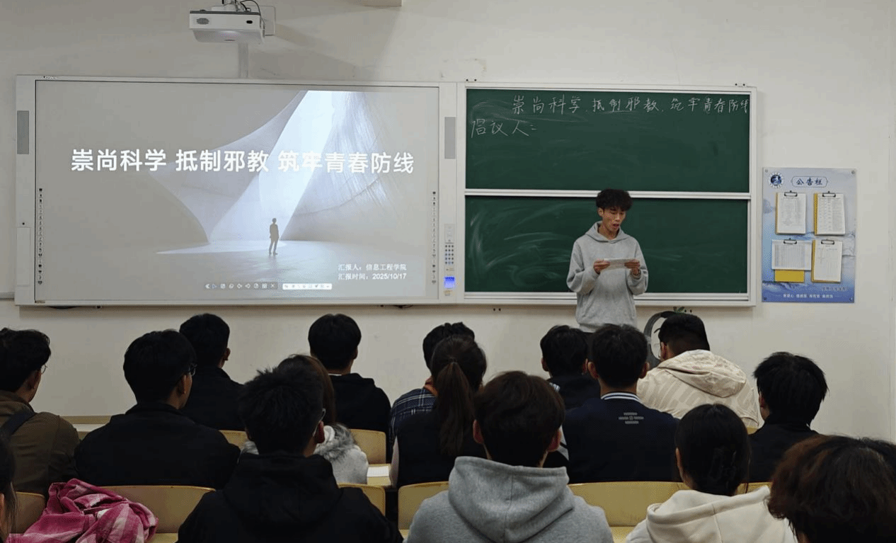 本站讯 为进一步净化校园环境,强化学生思想引领,提升青年学子对邪教组织的辨别能力和抵制意识,10月14日至19日,信息工程学院围绕“崇尚科学,抵制邪教,筑牢青春防线”主题,组织开展了系列教育活动,引导学生树立科学观念,守护校园意识形态安全。