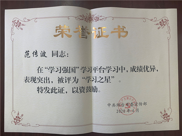 本站讯 近日,烟台市委宣传部对全市学习强国“学习之星”进行了通报表彰。我校宫国学同志、范传波同志荣获烟台市“学习之星”荣誉称号。