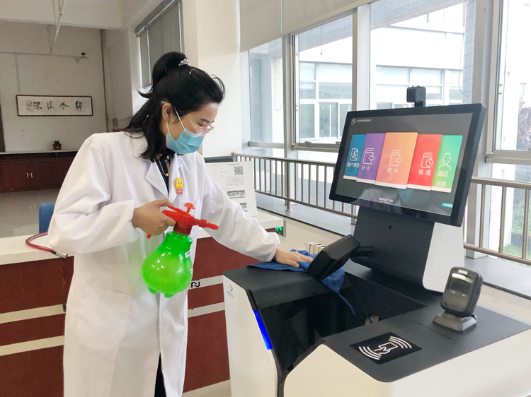 做到加强卫生防疫。加强馆内卫生防疫工作,每日对入馆人员进行体温检测登记,做好日常防护,佩戴口罩,配备足够的洗手液(肥皂)、消毒液及器具。做好日常通风换气,保持室内空气流通,每天定期对电梯、楼梯扶手、卫生间、桌椅、自助借还机等进行清洁消毒,阻断感染源,全方位改善馆内环境卫生条件。将口罩等医疗废弃物放置在专用垃圾箱内,定时有效安全处理。