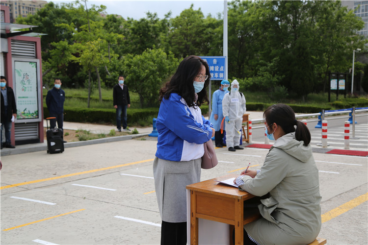 学校东大门口依次设置下车区、入校通道、测温区、消毒区、身份核验区、临时留观室等区域。学生下车后间隔1米有序排队,在测温区测温员依次测量体温,在消毒区进行行李消毒、鞋底消毒、手部消毒,在身份核验区工作人员对学生的健康通行码及学生证进行查验,上交健康备档卡、承诺书等材料。体温正常、信息确认无误学生进入校园。如发现体温异常学生由测温人员引导至临时留观点,医护人员进行体温复测和症状检查、流行病学史调查、信息上报、联系120送医就诊、通道和临时留观点消毒。