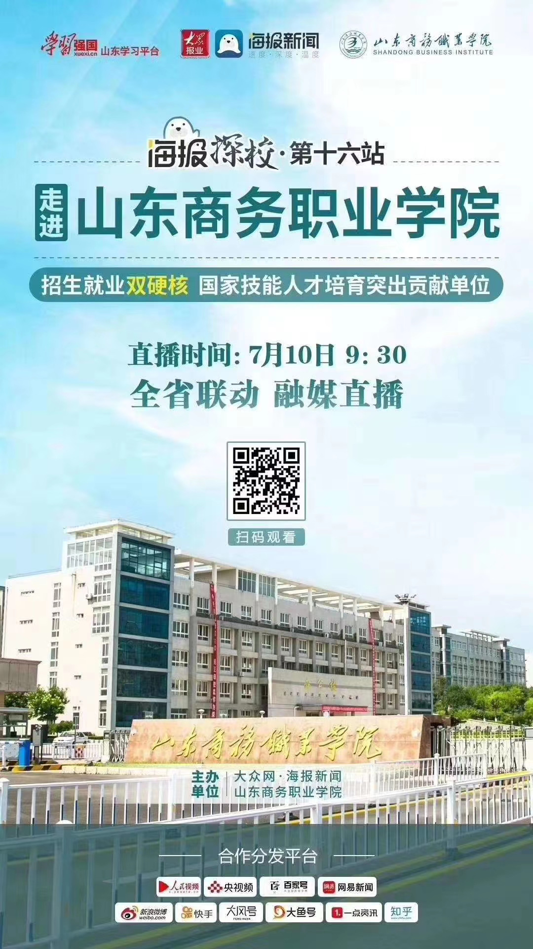 本站讯 7月10日,由山东省委宣传部指导,大众网 海报新闻联合“学习强国”山东学习平台和全国十余家媒体平台策划推出的“海报探校|助力职教新高地建设——山东高职院校网上探校直播活动”,走进山东商务职业学院。学校党委书记耿建敏、院长杨新春在直播中与广大网友亲切互动,并与各相关部门负责人一同在云端对学校进行推介。