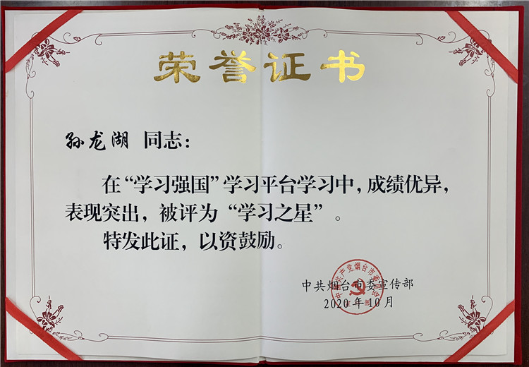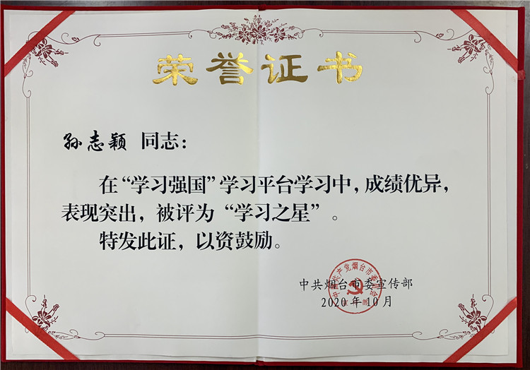 本站讯 近日,烟台市委宣传部在全市组织开展了2020年第三季度“学习之星”评选活动。经过层层筛选上报,我校孙龙湖、袁磊、孙志颖三位党员同志获此殊荣。