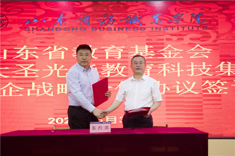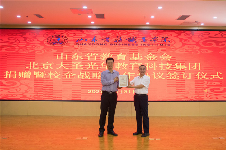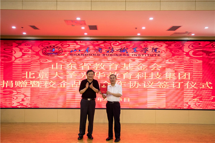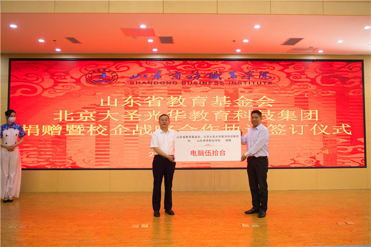 本站讯 5月31日,山东省教育基金会、北京大圣光华教育科技集团捐赠暨校企战略合作协议签订仪式在我校党性教育基地举行,我校党委书记耿建敏、山东省教育厅原副厅长、巡视员,山东省教育基金会理事长陈光华、北京大圣光华教育科技集团董事长李文绪出席仪式。仪式由学校副院长张云生主持。