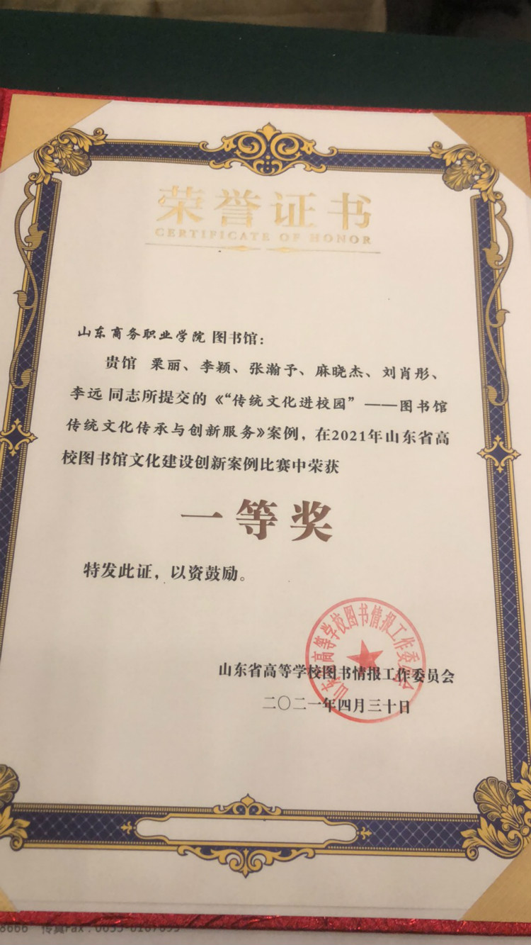 本站讯 6月23至25日,山东省高校图书馆文化建设与发展研讨会在日照召开,我校图书馆提报的案例《非遗文化进校园 中华传统共传承—“传统文化进校园”—图书馆传统文化传承与创新服务》经过专家评审,荣获山东省高校图书馆文化建设创新案例大赛一等奖。