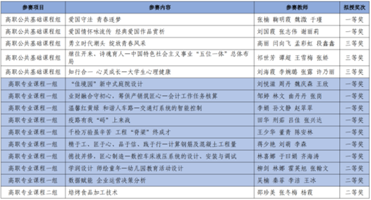 本站讯 日前,烟台市公布了2021年全市职业院校教师教学大比武活动获奖作品名单,我校15支参赛队伍全部获奖,其中,一等奖9项,二等奖3项,三等奖3项。