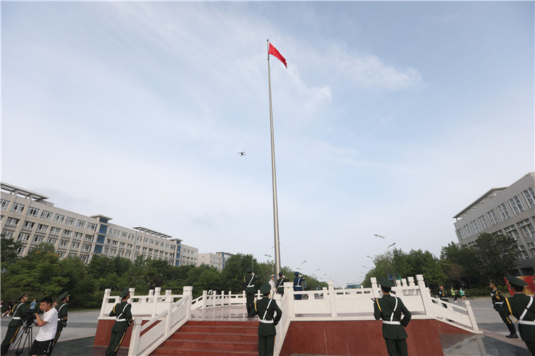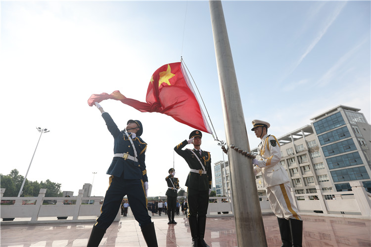 7点30分,升旗仪式正式开始。参加人员着装整齐,列队肃立。国旗护卫队成员身着笔挺礼服、肩披金黄绶带,紧握钢枪、英姿飒爽,迈着整齐的步伐向国旗杆走来。伴随着雄壮的《义勇军进行曲》,鲜艳的五星红旗缓缓升起,迎风飘扬。全体人员向五星红旗行注目礼,向伟大祖国致敬。