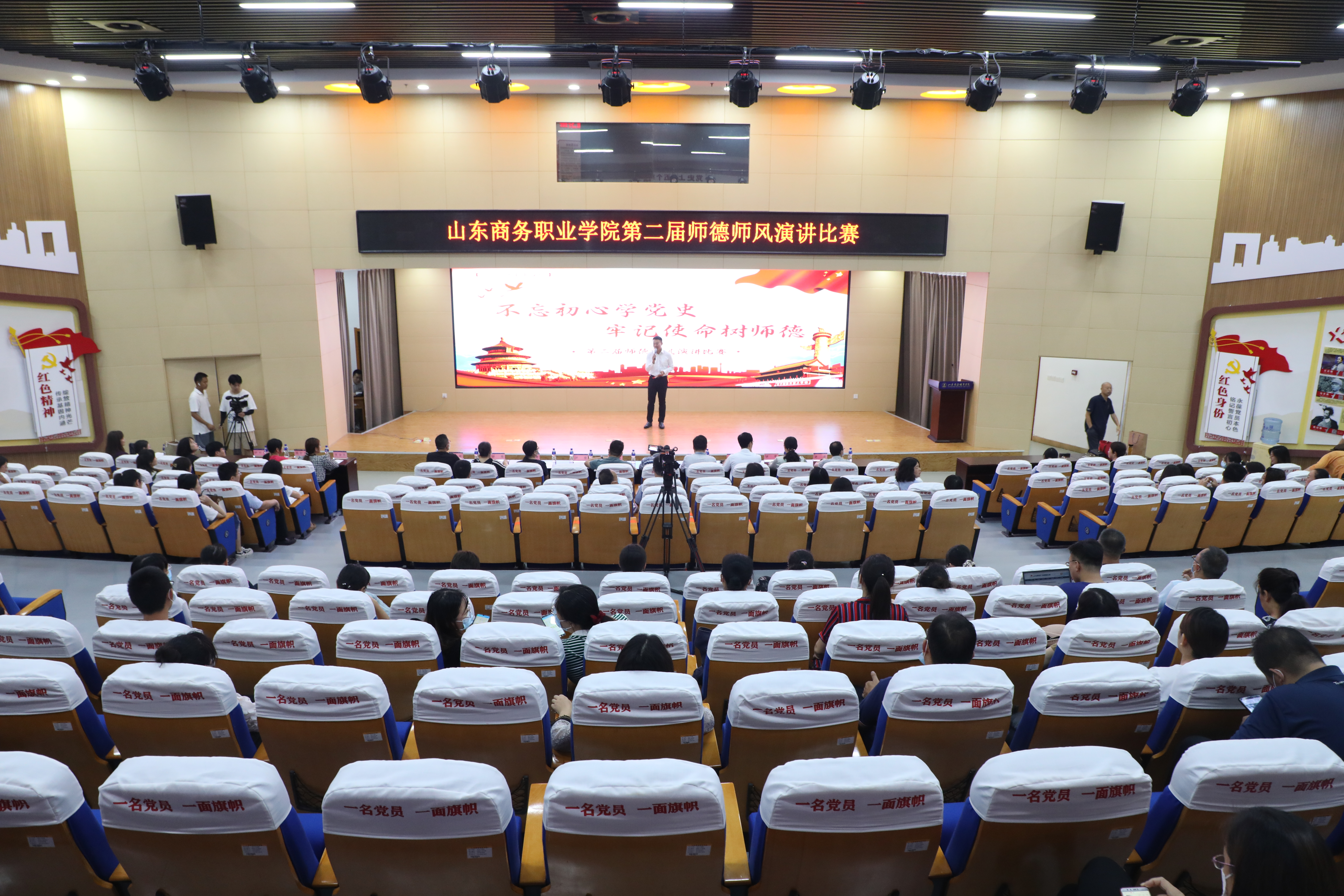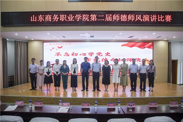 本站讯 9月16日下午,我校在党性教育基地举行山东商务职业学院“不忘初心学党史,牢记使命树师德”师德师风演讲比赛决赛,学校党委书记耿建敏、党委副书记刘艳蔚、副校长张云生及各二级学院党总支书记、教师代表等参加了本次活动。