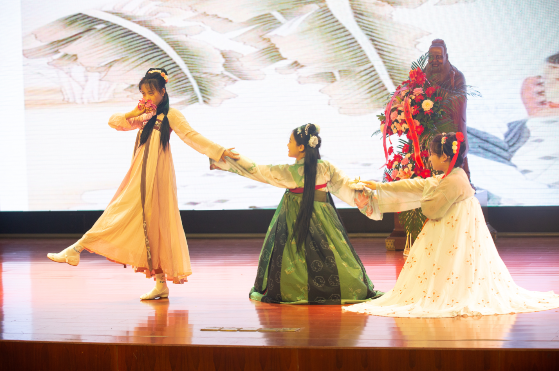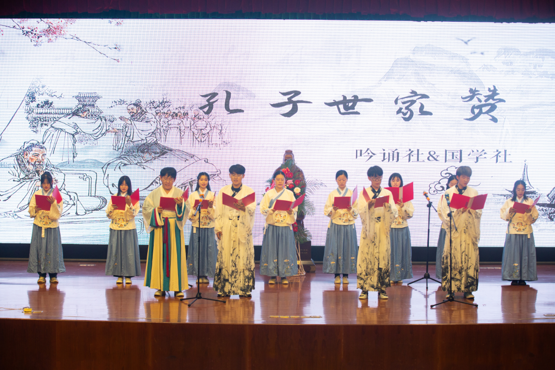 启动仪式以向孔子敬献花篮开始,主持人带领师生齐声朗诵感恩词,向孔子三鞠躬致敬礼。活动的最后,进行了文艺演出。曲军晖老师的一曲铿锵有力、激情四射的《忘不了》拉开了演出序幕,接下来的《孔子世家赞》《幽兰操》《簪花仕女》《明月几时有,把酒问青天》等一个个朗诵、吟诵、舞蹈节目,精彩纷呈,目不暇接,最后由傅丽娜、李秋霖、于秀娟三位老师演唱的高亢、甜美的《梨花颂》,更是将活动推向高潮。