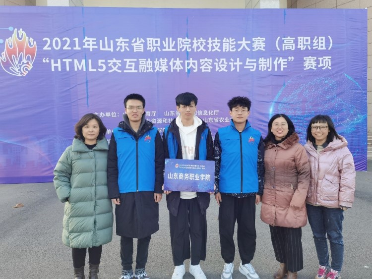 本站讯 11月25日,山东省职业院校技能大赛(高职组)“HTML5交互融媒体内容设计与制作”赛项在威海成功举办,由我校信息工程学院胡明凯、田运轲、李先发同学组成的山东商务职业学院代表队荣获一等奖。