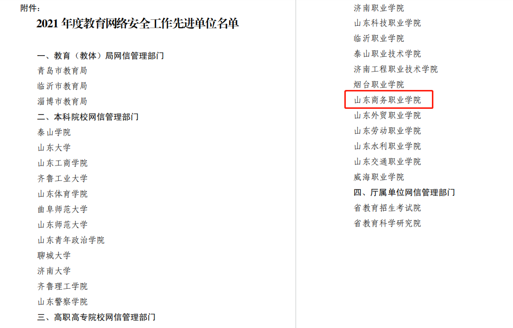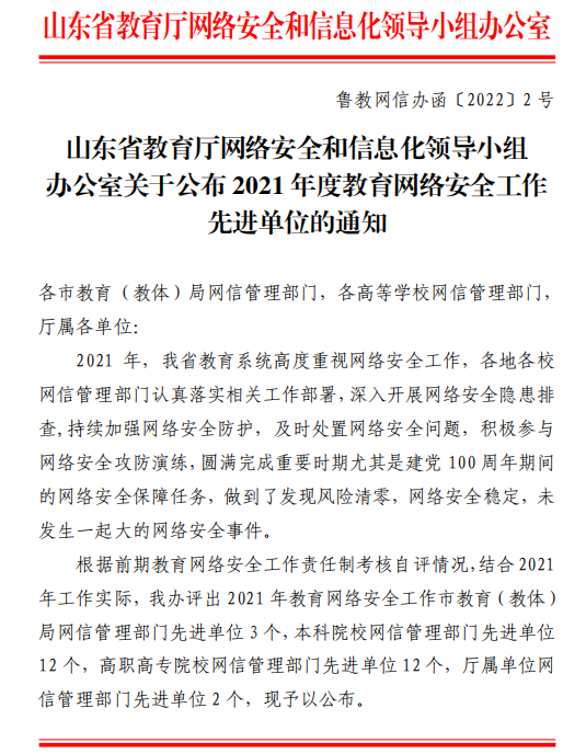 本站讯 近日,山东省教育厅发布《关于公布2021年度教育网络安全工作先进单位的通知》,表彰全省2021年度教育网络安全工作先进单位,全省共12所高职高专院校受表彰,我校位列其中。
