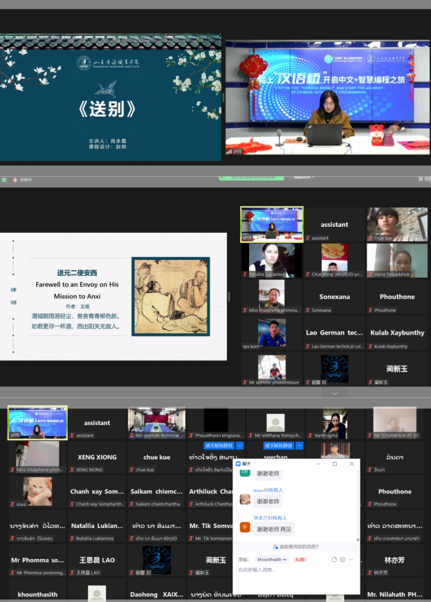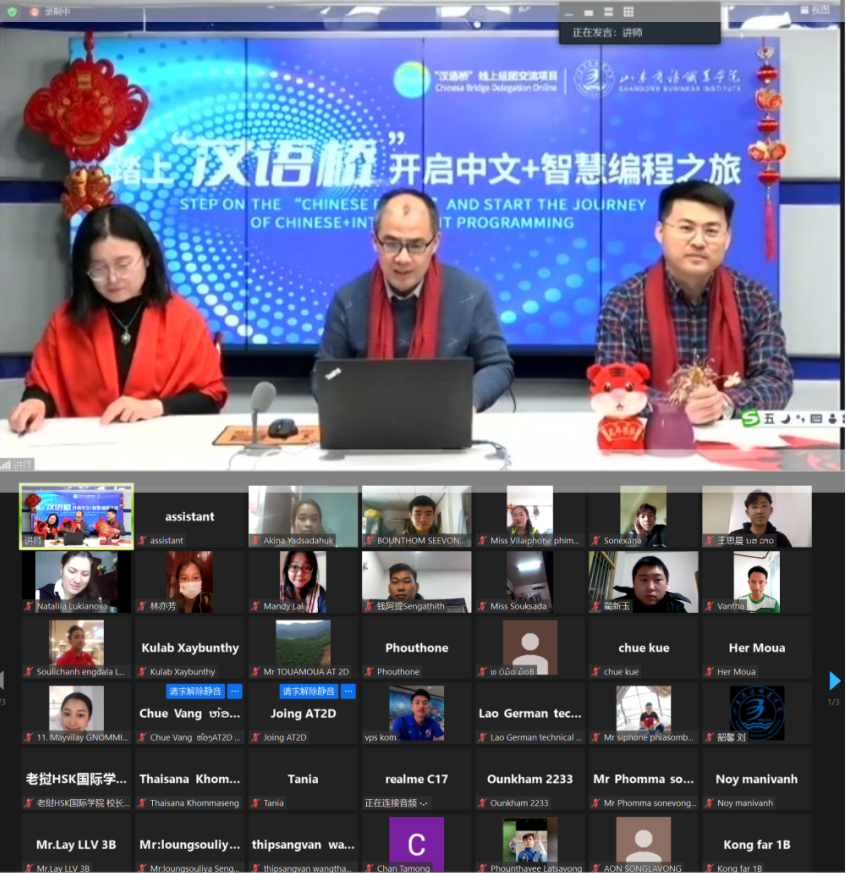 本站讯 1月22日下午,由教育部中外语言交流合作中心主办、山东商务职业学院承办的2021年“中文+智慧编程” 汉语桥线上团组交流项目闭营仪式通过线上会议形式在我校举行。来自老挝、泰国、马来西亚、新加坡、乌克兰、塔吉克斯坦、越南、日本、埃及等9个国家的276名营员与山东商务职业学院的教师们齐聚云端,一起回顾了这五天的精彩瞬间,共同见证此次活动的完美收官。