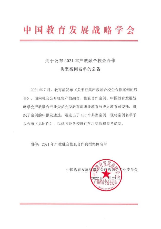 本次案例的成功入选,标志着我校产教融合发展水平再上新台阶。借此契机,学校将紧抓国家“十四五”规划重大历史机遇,在巩固现有成果的基础上,不断拓展与企业的合作领域,持续探索创新合作方式,不断促进教育链、人才链与产业链、创新链的有机衔接,聚势谋远,精耕细作,全面推进产教融合工作的可持续健康发展,全力推动教育教学质量和人才培养质量的全面提升,实现学校提质培优高质量发展。(通讯员:刘琛 撰稿:孙琳 陈涌 审核:刘晓军 范彩荣 值班审核:梁倩 成雪)