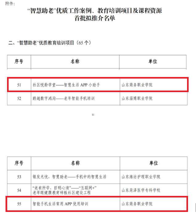 本站讯 日前,教育部公示了首批“智慧助老”优质工作案例、优质教育培训项目、优质课程资源推介名单,我校会计金融学院邹婷老师的“社区悦龄学堂—智慧生活APP小助手”、经济管理学院董艳老师的“智能手机生活常用APP使用培训”,成功入选教育部优质教育培训项目。
