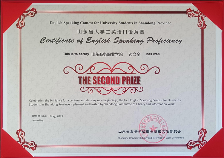 本站讯 近日,由山东省高等学校图书情报工作委员会主办的“百年话辉煌 青春再出发”主题英语口语演讲竞赛圆满落下帷幕,经过激烈角逐我校21级文化旅游学院边文辛、21级信息工程学院岳姿涵两名同学从全省1万余名选手中脱颖而出,进入决赛,边文辛同学勇夺二等奖。