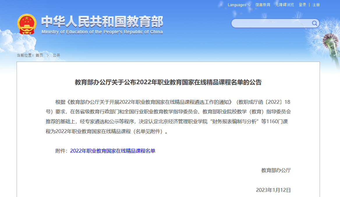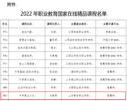 本站讯 1月12日,教育部办公厅公布了2022年职业教育国家在线精品课程名单,经组织专家遴选,确定了1160门职业教育国家在线精品课程,山东省85门在线精品课程。我校经济管理学院教师刘晓军主持的《中华商业文化》课程成功入选,这是我校首门国家级在线精品课程。