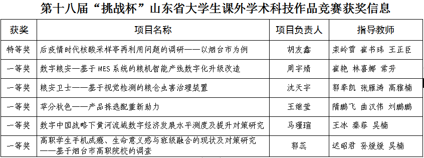 “挑战杯”竞赛备受高校广大师生以及社会各界的普遍关注,被誉为大学生学术科技活动的“奥林匹克”。本届竞赛职业院校类终审决赛于2023年5月18日至19 日在潍坊职业学院滨海校区举办。我校由创新创业指导中心带队,包括6支参赛团队的指导教师、学生共计43人赴大赛举办地参加决赛。赛事斩获特等奖1项、一等奖5项、二等奖5项、三等奖4项。