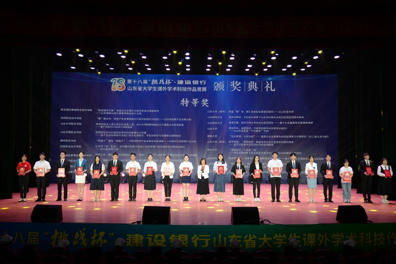 本站讯 5月22日上午,第十八届“挑战杯”·建设银行山东省大学生课外学术科技作品竞赛闭幕式暨颁奖典礼在齐鲁工业大学(山东省科学院)长清校区艺体中心礼堂举办。我校捧得“优胜杯”,1件作品获特等奖,学校获优秀组织奖。