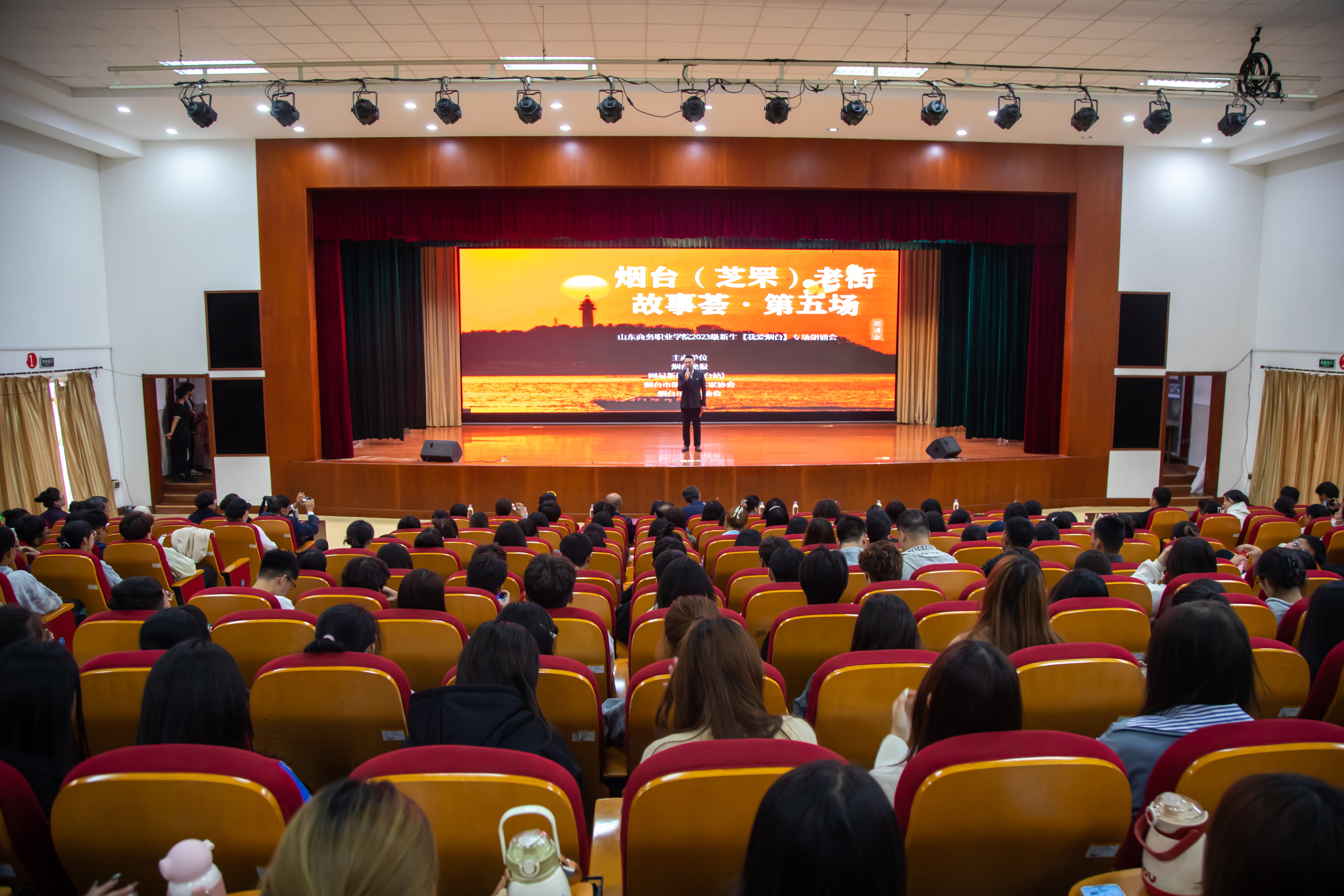 本站讯 10月17日下午,烟台(芝罘)老街故事荟第五场暨山东商务职业学院新生【我爱烟台】专场朗诵会在音乐厅隆重举行。活动由烟台晚报、网易新闻(烟台站)、烟台市朗诵艺术家协会、烟台市作家协会主办,我校图书馆、学生工作处(团委)联合承办,校党委书记孙云茂,副校长陶传蔚出席,学校部分教职工、老干部和23级新生参加。