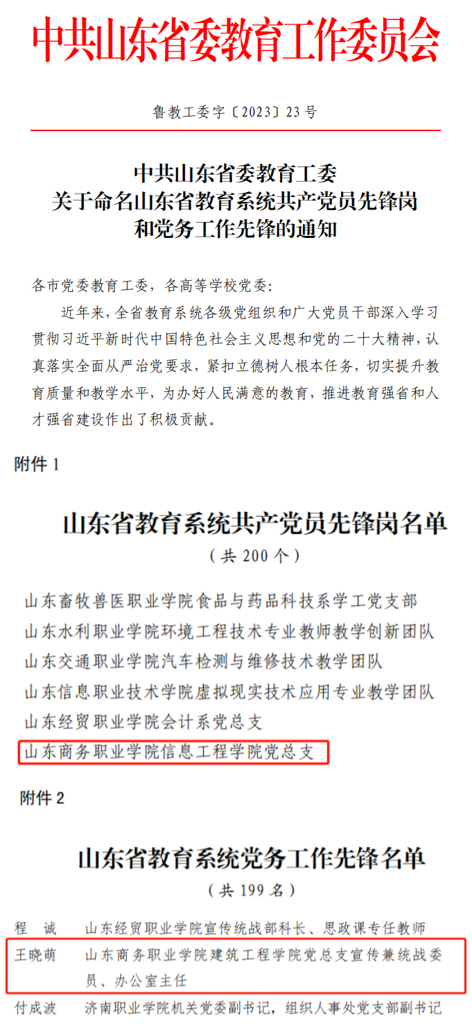 本站讯 近日,根据中共山东省委教育工委印发的《关于命名山东省教育系统共产党员先锋岗和党务工作先锋的通知》(鲁教工委字〔2023〕23号)文件精神,我校信息工程学院党总支获“山东省教育系统共产党员先锋岗”命名,建筑工程学院教师王晓萌获“山东省教育系统党务工作先锋”命名。
