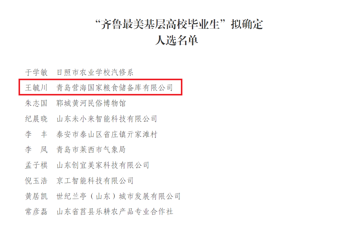本站讯 近日,山东省人力资源和社会保障厅公布了山东省2023年全国“最美基层高校毕业生”暨我省“齐鲁最美基层高校毕业生”拟定人选公示名单,我校粮油食品学院粮油储藏与检测技术专业2013届毕业生王毓川成功入选。