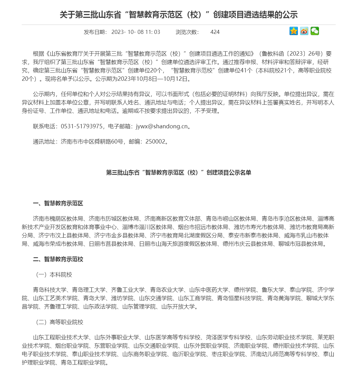 本站讯 近日,山东省教育厅公布了第三批山东省“智慧教育示范区(校)”创建项目遴选结果,我校经学校申报、材料评审和专家答辩等环节,成功入选山东省高等职业院校“智慧教育示范校”创建单位。