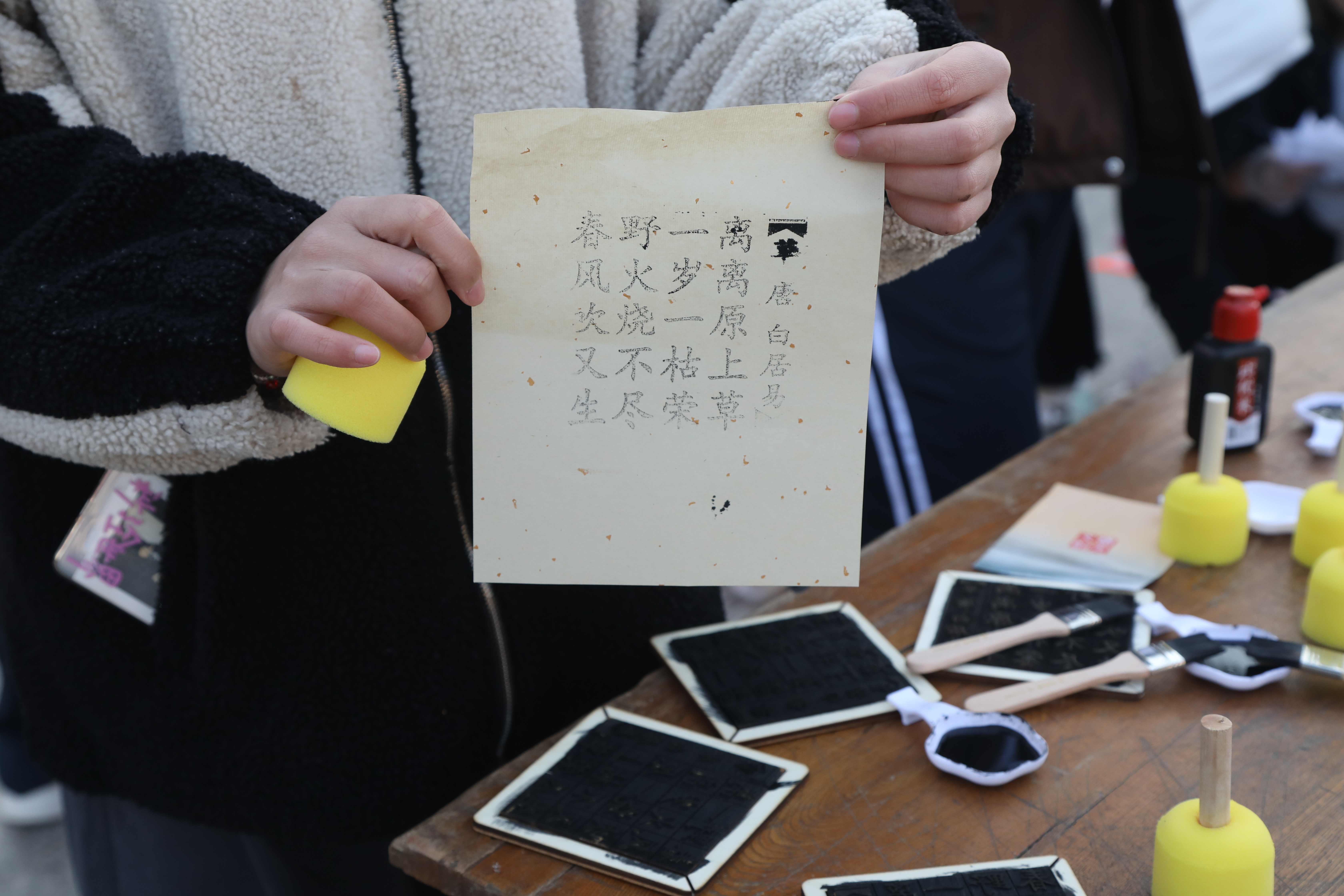 活字印刷的展位前也聚拢了许多同学,大家将墨汁研磨后认真涂画在自己选好的古诗拓字板上,在浓浓墨香中真切体会中华优秀传统文化的魅力。