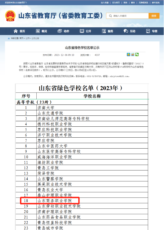 本站讯 12月6日,山东省教育厅公示2023年“山东省绿色学校”名单,我校榜上有名。