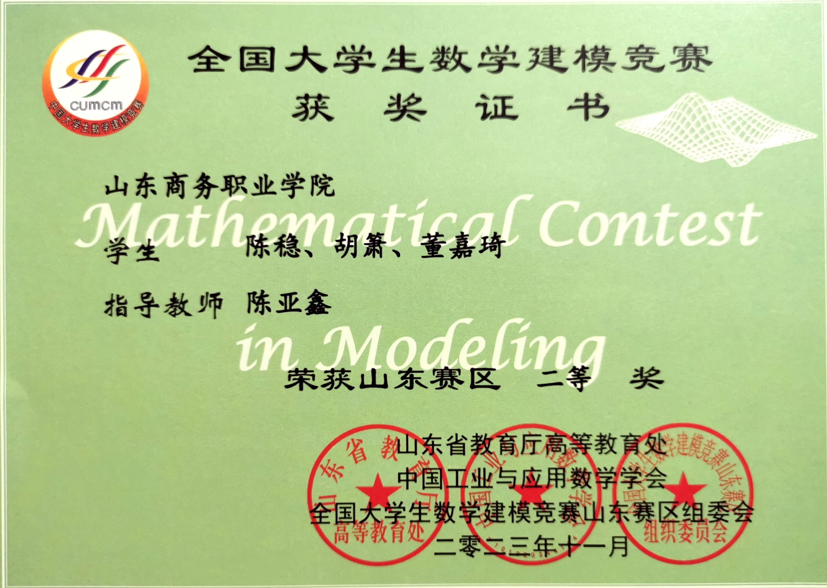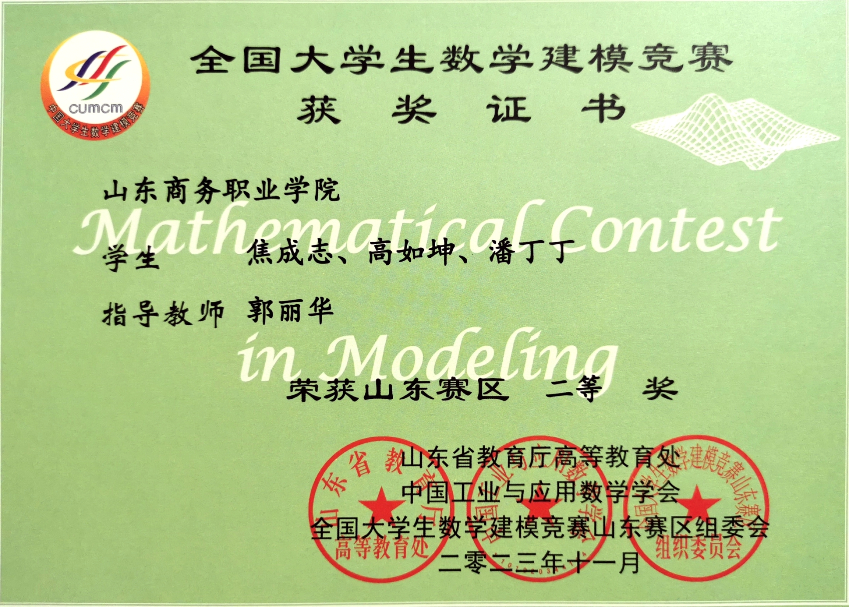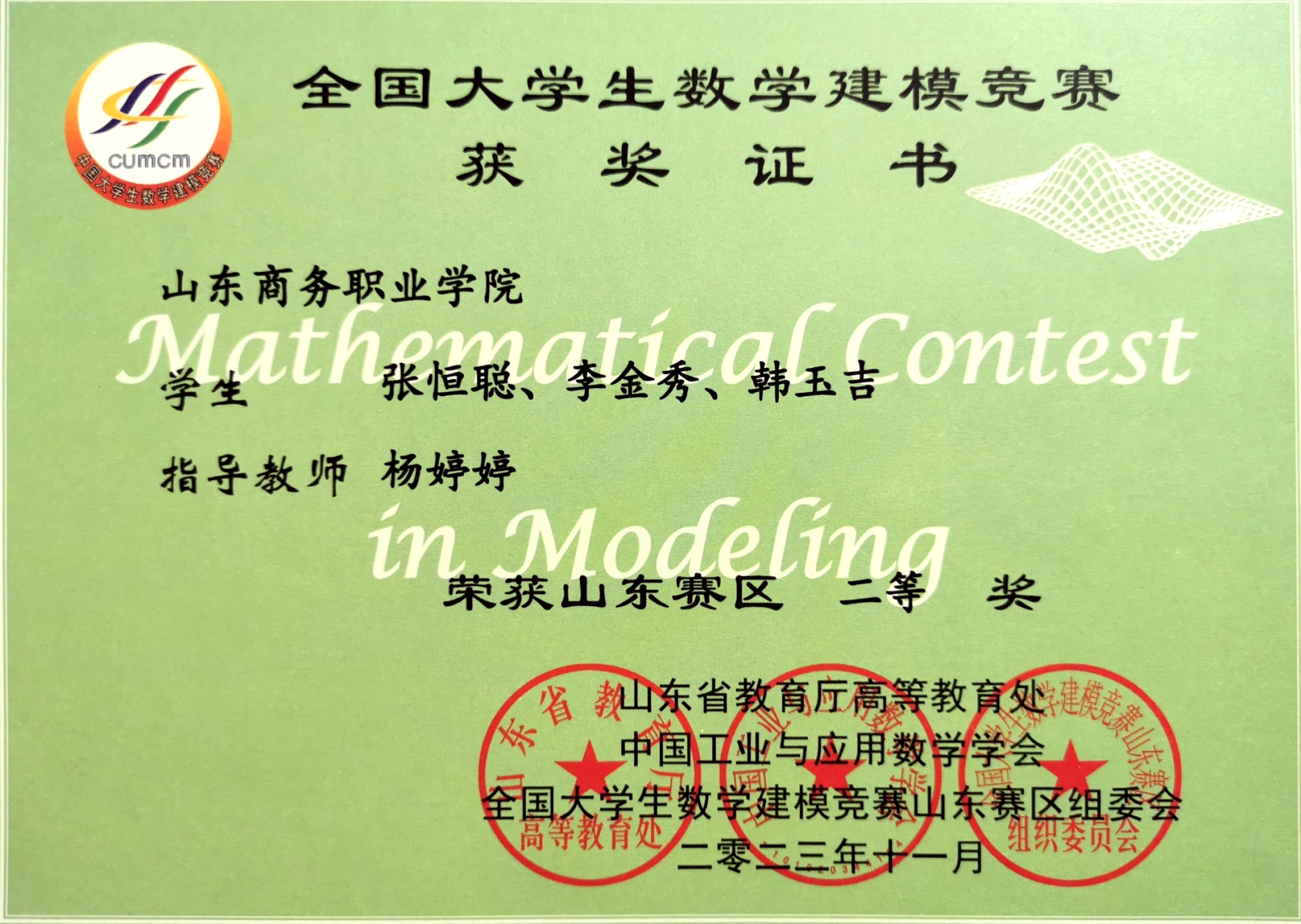 本站讯 近日,2023年全国大学生数学建模竞赛成绩揭晓。我校组织12支队伍参赛,共获得山东赛区二等奖3项,三等奖4项,获奖项数位居高职院校前列。