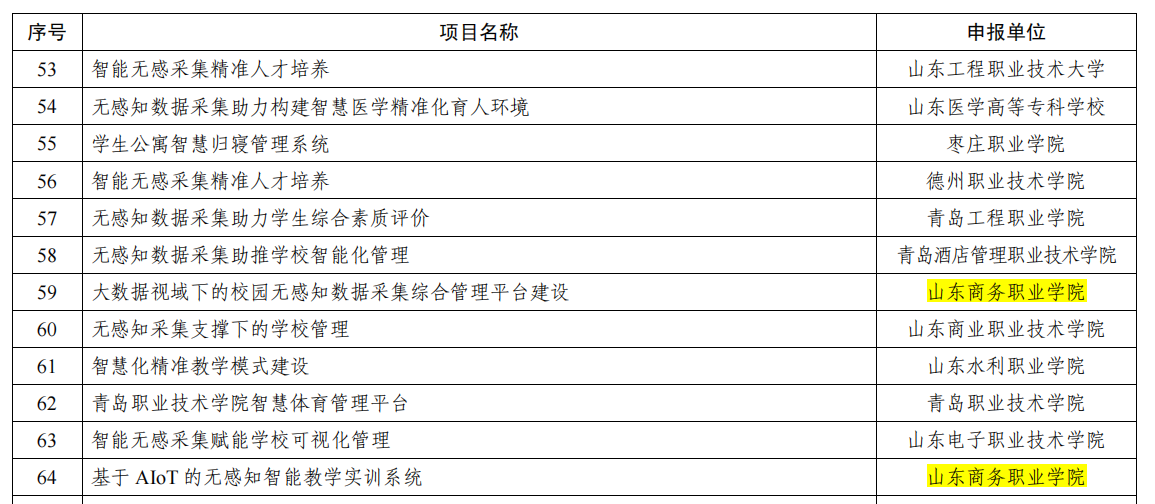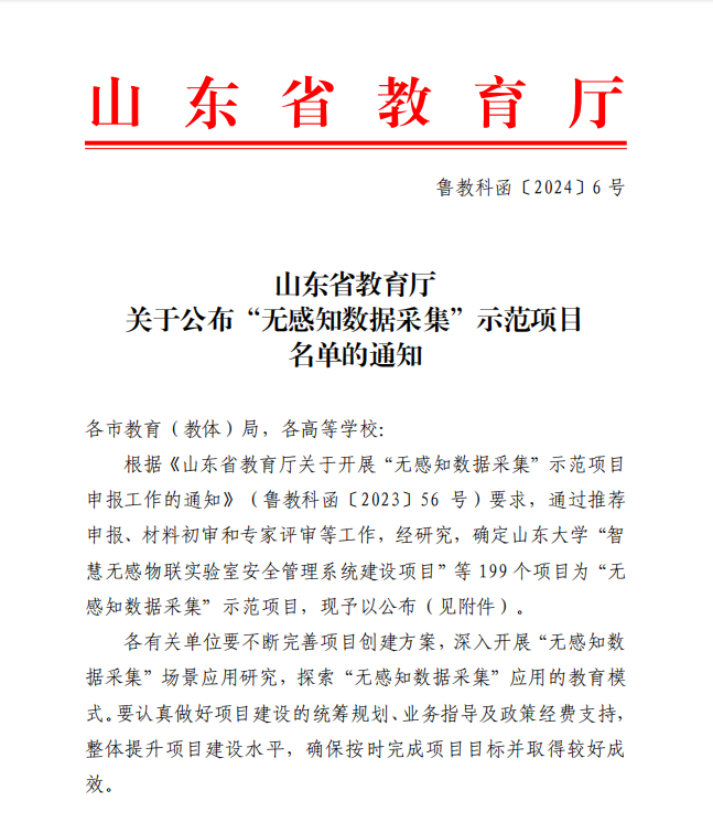 本站讯 近日,山东省教育厅公布了2023年度“无感知数据采集”示范项目的评选结果,我校申报的《大数据视域下的校园无感知数据采集综合管理平台建设》和《基于AIoT的无感知智能教学实训系统》成功入选。