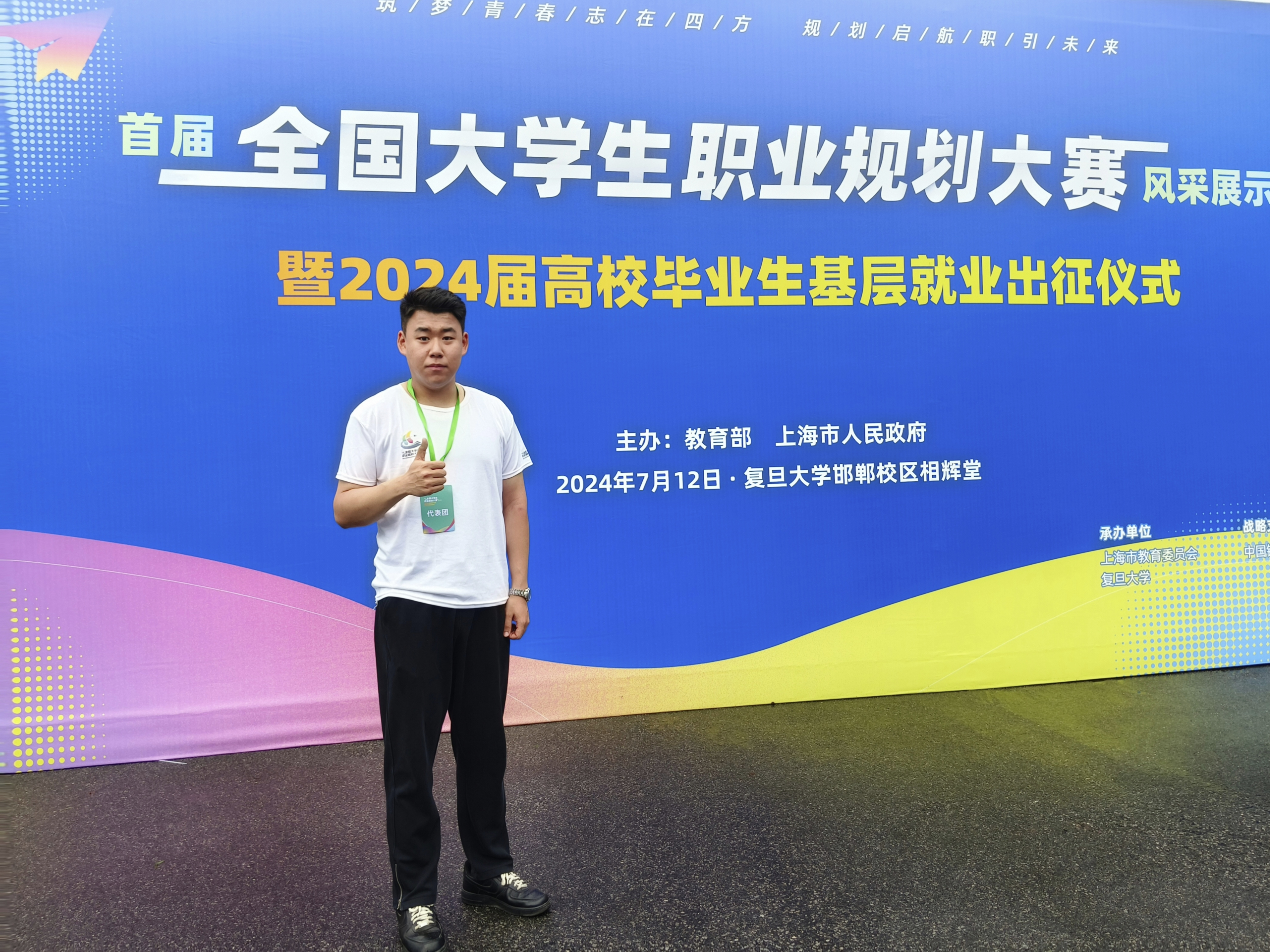 本站讯 7月12日,首届全国大学生职业规划大赛风采展示暨2024届高校毕业生基层就业出征仪式在上海举行。我校学子隋松昊作为国赛金奖选手代表山东参加此次活动。