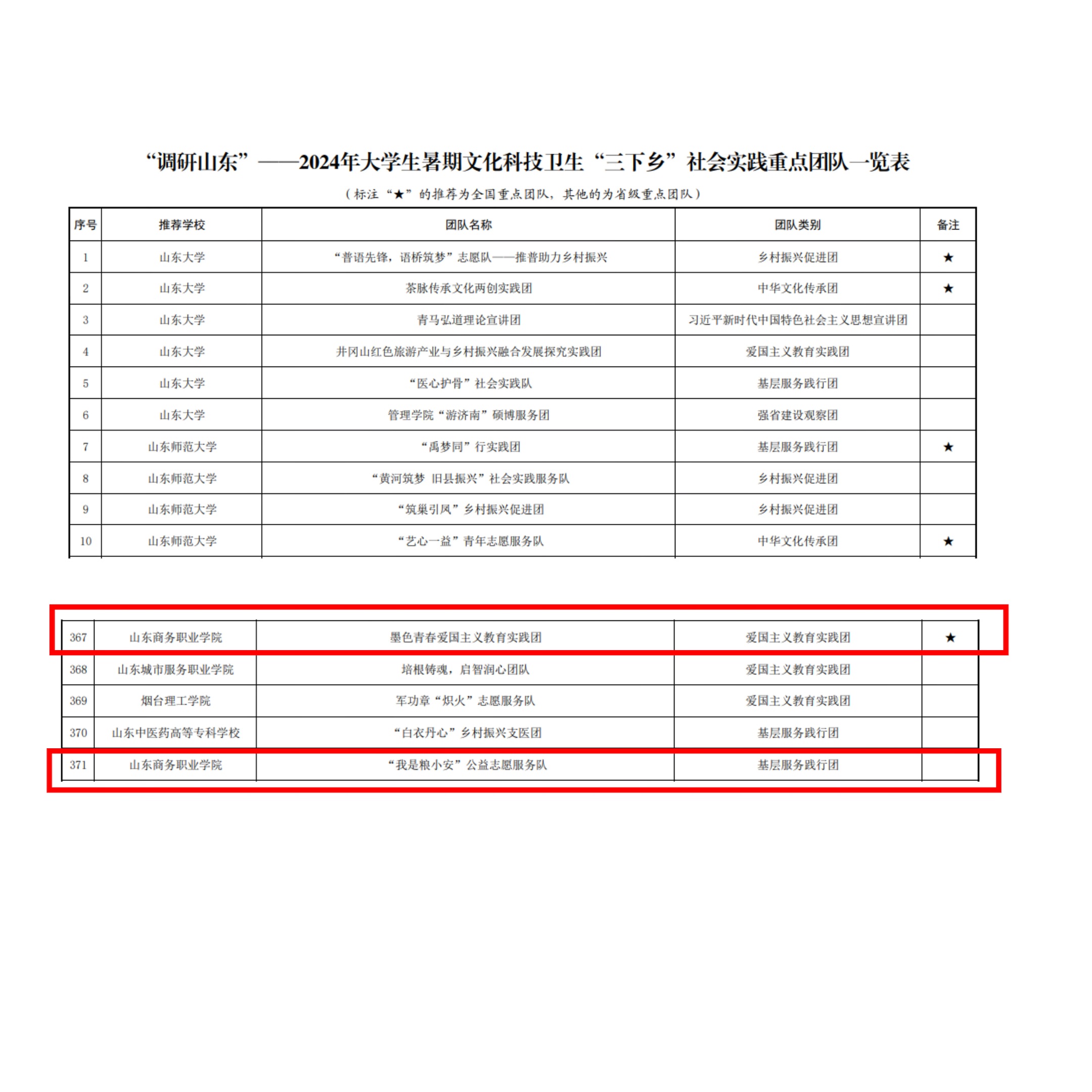 本站讯 根据中央宣传部、教育部、共青团中央、全国学联《关于开展2024年全国大学生暑期文化科技卫生“三下乡”社会实践活动的通知》,共青团山东省委开展了“调研山东”—2024大学生暑期文化科技卫生“三下乡”社会实践活动,学校社会实践团队精心筹备,积极申报,最终,建筑工程学院“墨色青春爱国主义教育实践团”及信息工程学院“我是粮小安公益志愿服务队”分别入选全国重点团队及省级重点团队。