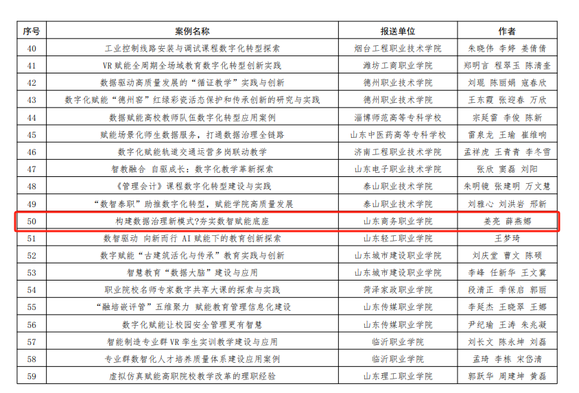本站讯 近日,我校围绕数据赋能管理服务和教学发展规划,构建信息化管理闭环体系,编写了《构建数据治理新模式 夯实数智赋能底座》应用案例,成功获评山东省教育厅公布的2024年数字化赋能教育管理信息化建设与应用典型案例。