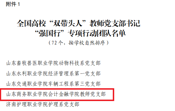 本站讯 近日,教育部在全国组织开展高校“双带头人”教师党支部书记“强国行”专项行动(以下简称“强国行”专项行动),经教育厅推荐并报教育部专项行动办备案审核,我校会计金融学院教师党支部成功入选“强国行”专项行动团队。