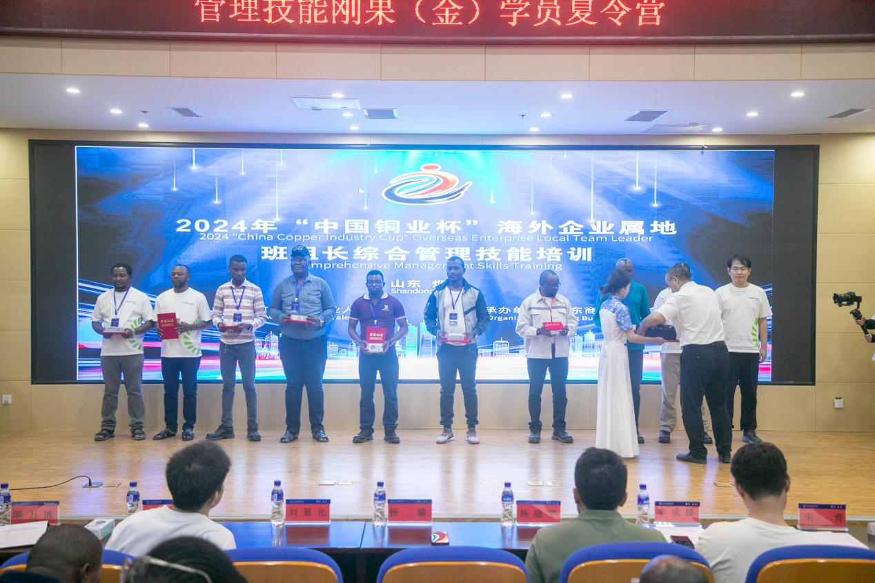 本站讯 9月7日,由有色金属工业人才中心主办、我校承办的“中国铜业杯”海外企业属地班组长综合管理技能竞赛培训活动(烟台基地)结营仪式在我校党性教育基地圆满落幕。有色金属工业人才中心、刚果金中国铝业集团有限公司所属中国铝业几内亚有限公司、中铁资源集团有限公司所属华刚矿业股份有限公司,以及北方矿业有限责任公司所属刚果(金)拉米卡股份有限公司、科米卡矿业简易股份有限公司和我校国际教育学院相关领导出席闭营仪式。
