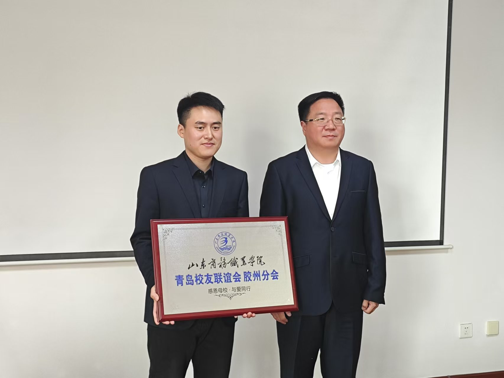 张越在致辞中对青岛校友联谊会胶州分会的成立表示祝贺,向在胶州的校友们致以诚挚的问候。张越介绍了学校在发展的过程中取得的新成就、新突破,同时向一直以来关心、支持学校发展的校友们表示感谢,并希望胶州分会的成立,能成为校友联系学校的纽带,发挥桥梁作用,更好的服务校友、服务学校。最后,他诚挚的邀请校友们能于校庆期间重返母校,重温学校发展历史,共谋发展蓝图。致辞结束后张越对胶州分会的成立进行授牌,对新任会长、荣誉会长颁发聘书。