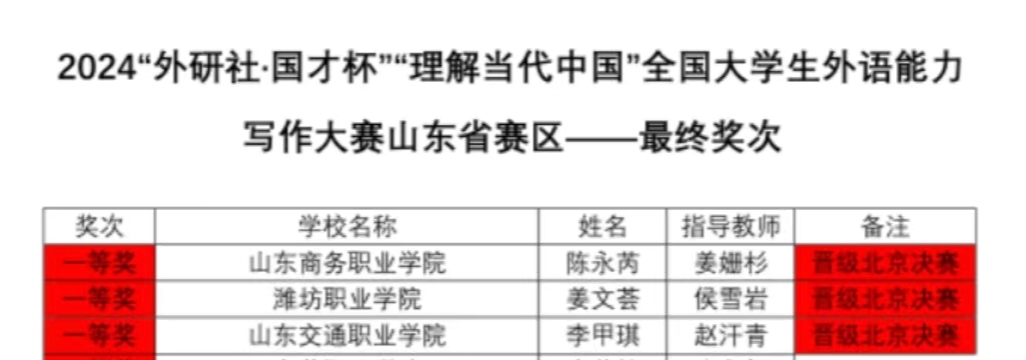 本站讯 10月27日,2024年“外研社·国才杯”理解当代中国全国大学生外语能力写作大赛(山东赛区)比赛在线上举办。我校文化旅游学院姜姗杉老师指导的陈永芮同学斩获山东赛区一等奖第一名的好成绩,成功晋级国赛。
