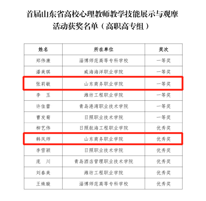 本站讯 12月6日,山东省首届高校心理教师技能展示与观摩活动在聊城大学举行,在本届赛事中我校心理教师张莉敏荣获一等奖,韩凤师荣获优秀奖。
