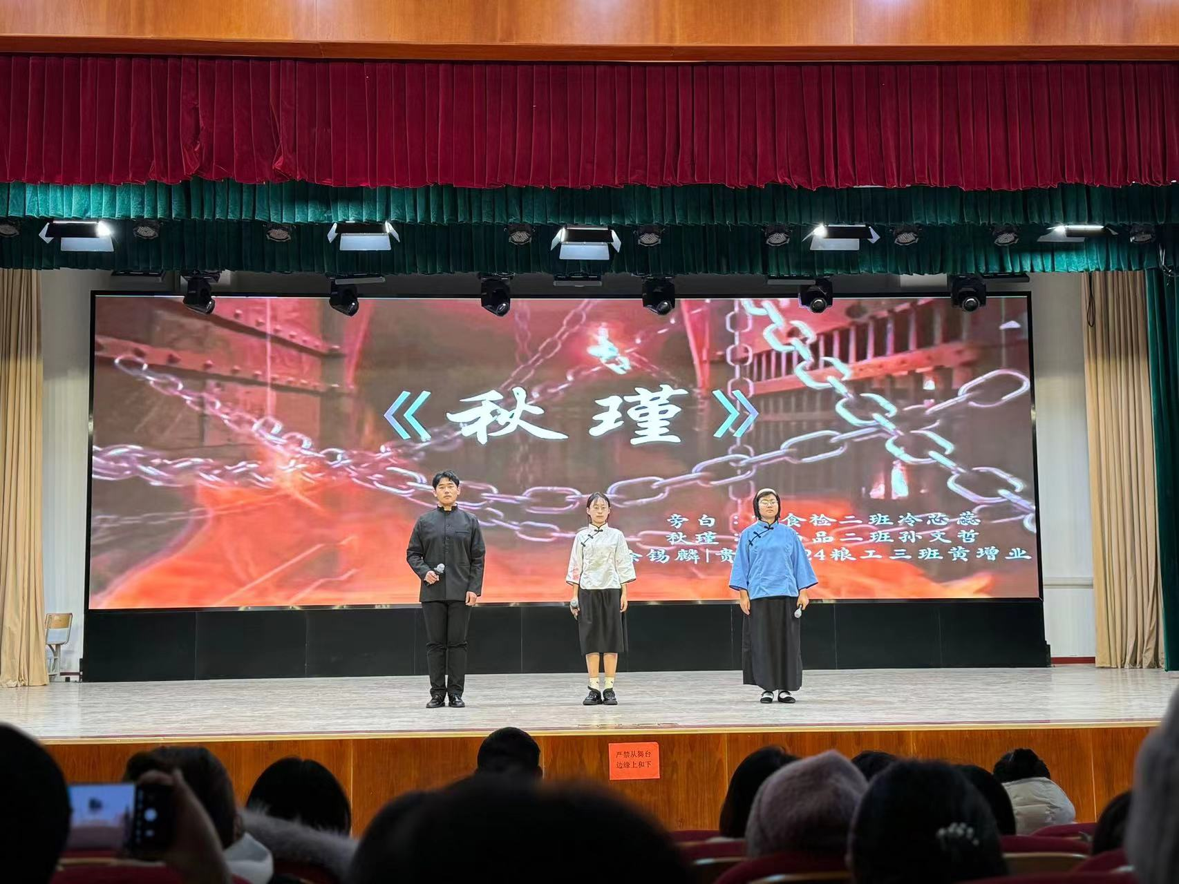 经过激烈角逐,文化旅游学院的武刘阳与季舒,以一首《不朽的雕像》,通过深情并茂的诵读和深邃的历史视角,仿佛将观众带入了那些被岁月铭记的瞬间,一字一句都掷地有声,震撼人心,最终问鼎冠军。粮油食品学院的朱彦颖,用温柔而富有感染力的声音,以一篇《秋天的怀念》,细腻地勾勒出秋日里的温情与思念,荣获亚军。同样来自粮油食品学院的冷芯蕊、孙文哲、黄增业,则以《秋瑾》为题,三人合力,将这位巾帼英雄的传奇故事演绎得淋漓尽致。他们激昂的诵读,不仅展现了秋瑾的英勇与不屈,更激发了现场每一位观众心中的爱国情怀与时代担当,荣获季军。