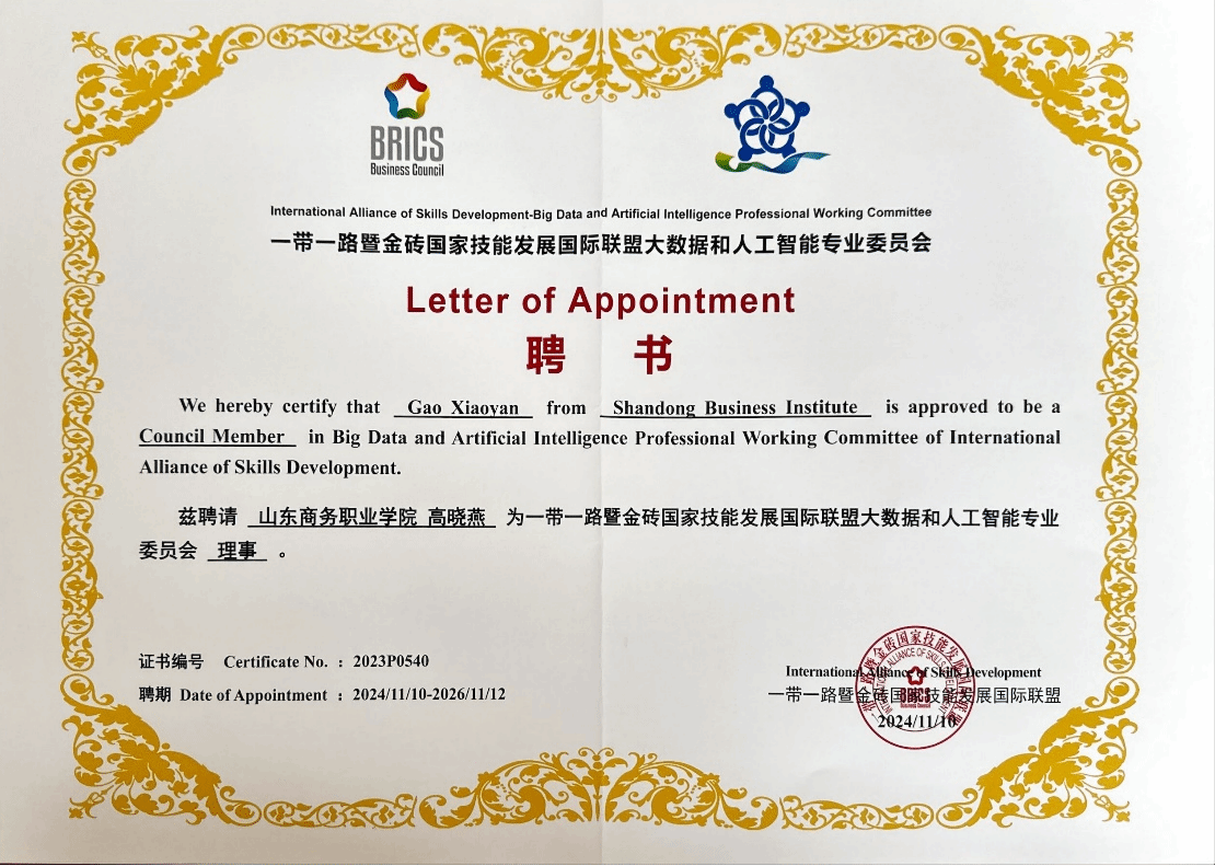 本站讯 近日,我校成功当选为一带一路暨金砖国家技能发展国际联盟大数据和人工智能专业委员会副主任单位,我校信息工程学院院长高晓燕成功当选为委员会理事,这一成果标志着学校在大数据及人工智能领域的专业建设与国际交流合作方面取得了较大突破。