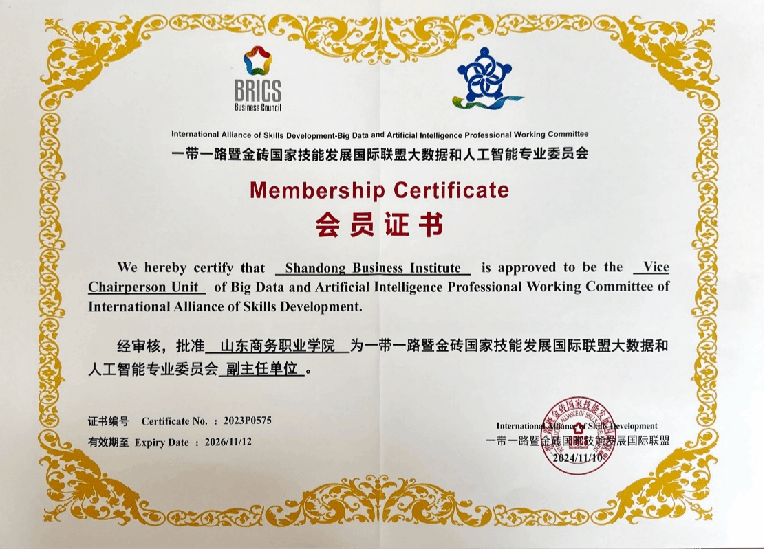 此次当选副主任单位,是对学校在大数据和人工智能领域专业建设及国际交流成果的高度认可。未来,学校将以此为契机,充分发挥自身优势,积极整合一带一路沿线国家与金砖国家在教育、技能、信息、标准等方面的资源。一方面,学校将助力联盟推动大数据和人工智能领域的国际交流,组织开展学术会议、职业技能大赛等活动,提升学校在国际职业教育领域的影响力;另一方面,也将借助联盟平台,进一步优化专业设置,更新教学内容,创新人才培养模式,努力为社会培育更多具备国际视野、高素质的技术技能人才,为推动大数据和人工智能产业发展贡献力量。(通讯员:孙志颖 撰稿:辛丹丹 审核:郭纪良 梁倩 值班审核:成雪)