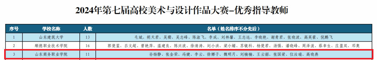 此次大赛的优异成绩,是对艺术设计学院“以赛促教、以赛促学”的理念以及教育教学成果的充分肯定,也是对学院发展方向与国家教育政策导向高度契合的有力证明。艺术设计学院将以此次获奖为契机,继续深化教育教学改革,加强师资队伍建设,提升教育教学质量,为培养更多具有创新精神和实践能力的美术与设计人才而不懈努力。(通讯员:姜俊岐 撰稿:孙杨静 审核:于洋 梁倩 值班审核:成雪)