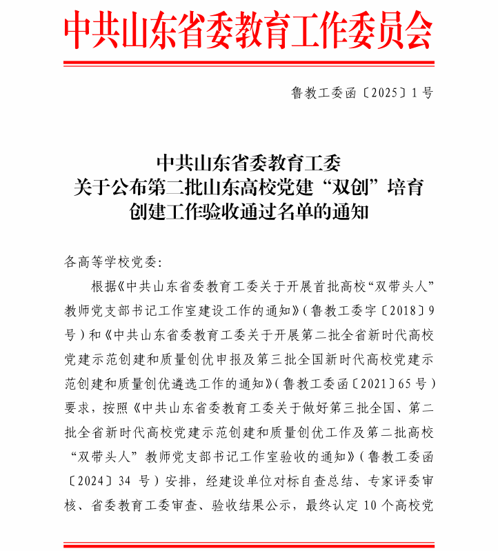 本站讯 近日,山东省委教育工委正式发文(鲁教工委函〔2025〕1号),我校建筑工程学院学生党支部以优异成绩通过第二批全省高校党建“双创”样板支部验收。该成果的取得,彰显了学校全面加强基层党建工作的鲜明导向和显著成效,标志着学校在构建“一融双高”党建工作格局中迈出了关键一步。