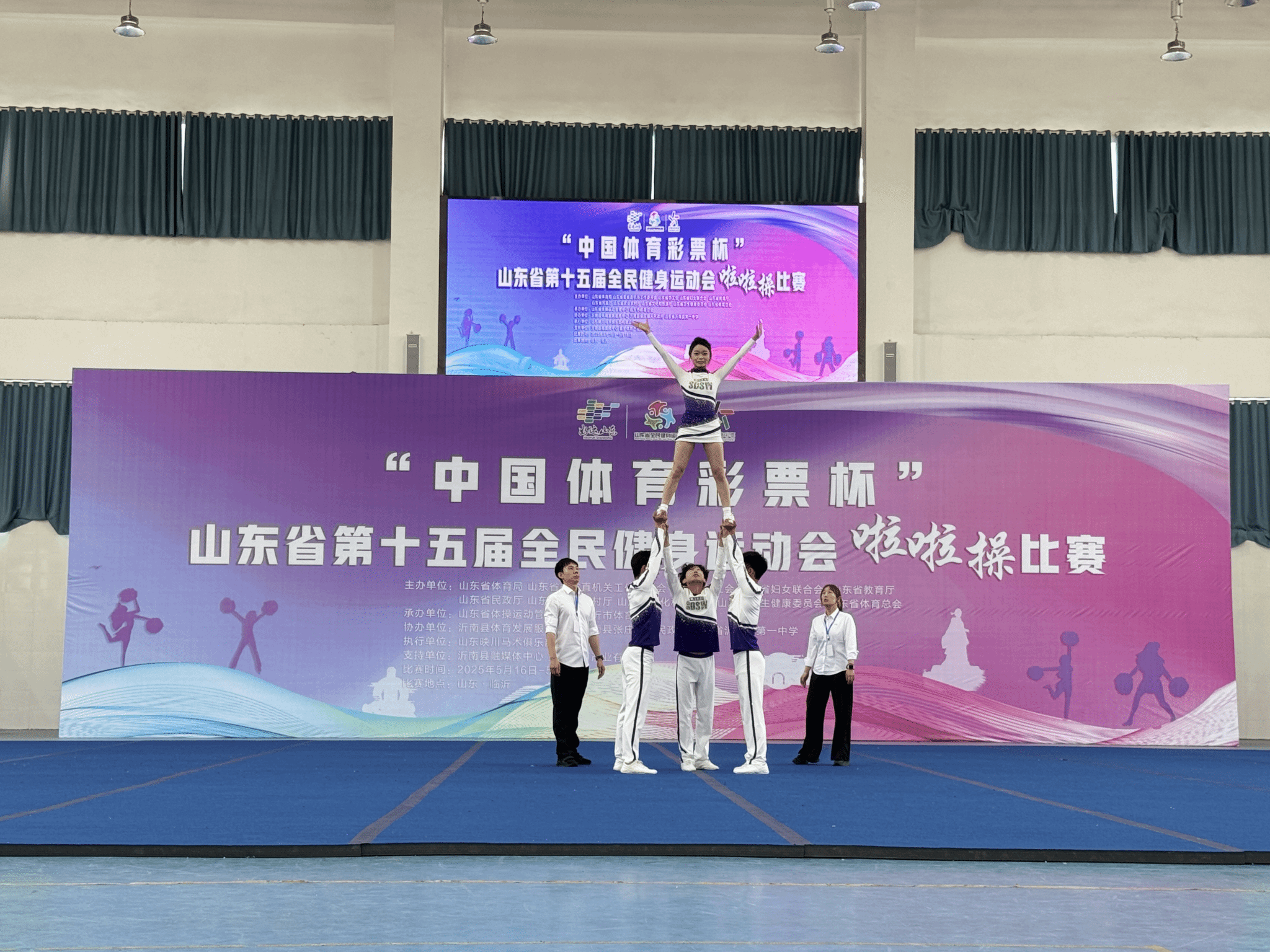 本站讯 5月16日—18日“中国体育彩票杯”山东省第十五届全民健身运动会啦啦操比赛在山东省沂南第一中学举行。该赛事由山东省体育局、山东省教育厅主办,临沂市体育局承办,山东省沂南第一中学协办。来自全省各地市57支代表队的800余名运动员汇聚一堂,同场竞技。我校共派出4支队伍14名运动员参加本次比赛,经过激烈角逐,最终荣获三金一银的优异成绩。