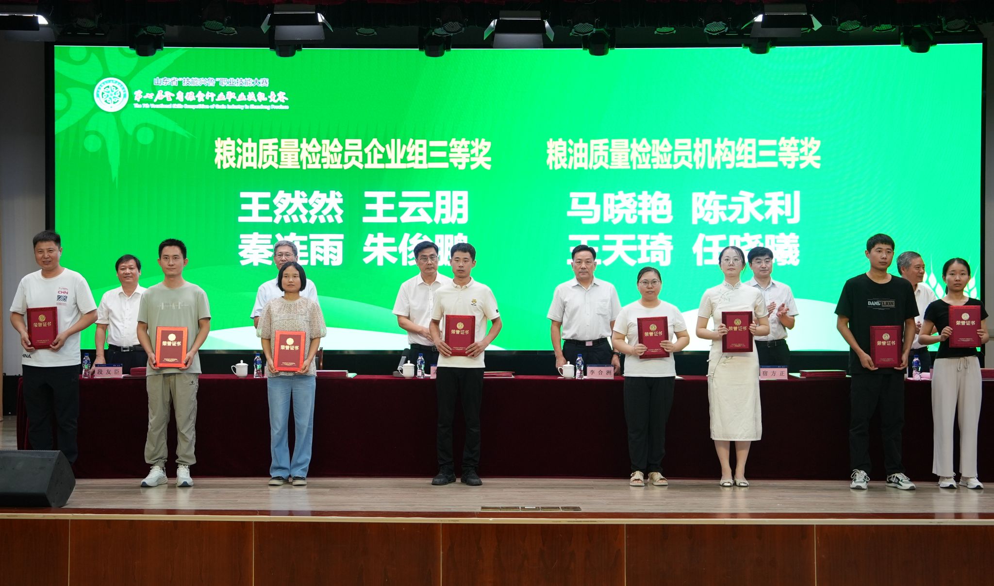 本次竞赛包括粮油保管员、粮油质量检验员两个职业,分为理论知识笔试和技能操作考核,理论知识占30%,技能操作考核占70%。参赛选手分设职工类和学生类,其中,职工类粮油质量检验员设企业组(粮油仓储企业)和机构组(粮油质量检验机构)。全省18支代表队86名选手经过激烈角逐,产生团体奖6个、组织奖9个,个人一等奖9名、二等奖13名、三等奖21名,职工类各职业第1名选手,经省人力资源社会保障厅核准后,颁发“山东省技术能手”证书并给予一次性奖励;对各职业前6名的选手(含学生)按规定晋升职业资格或技能等级。活动现场举行了颁奖仪式,优秀选手将代表山东省参加全国粮食行业职业技能竞赛。(撰稿:梁倩 审核:孙芹宝 值班审核:杜林梓)
