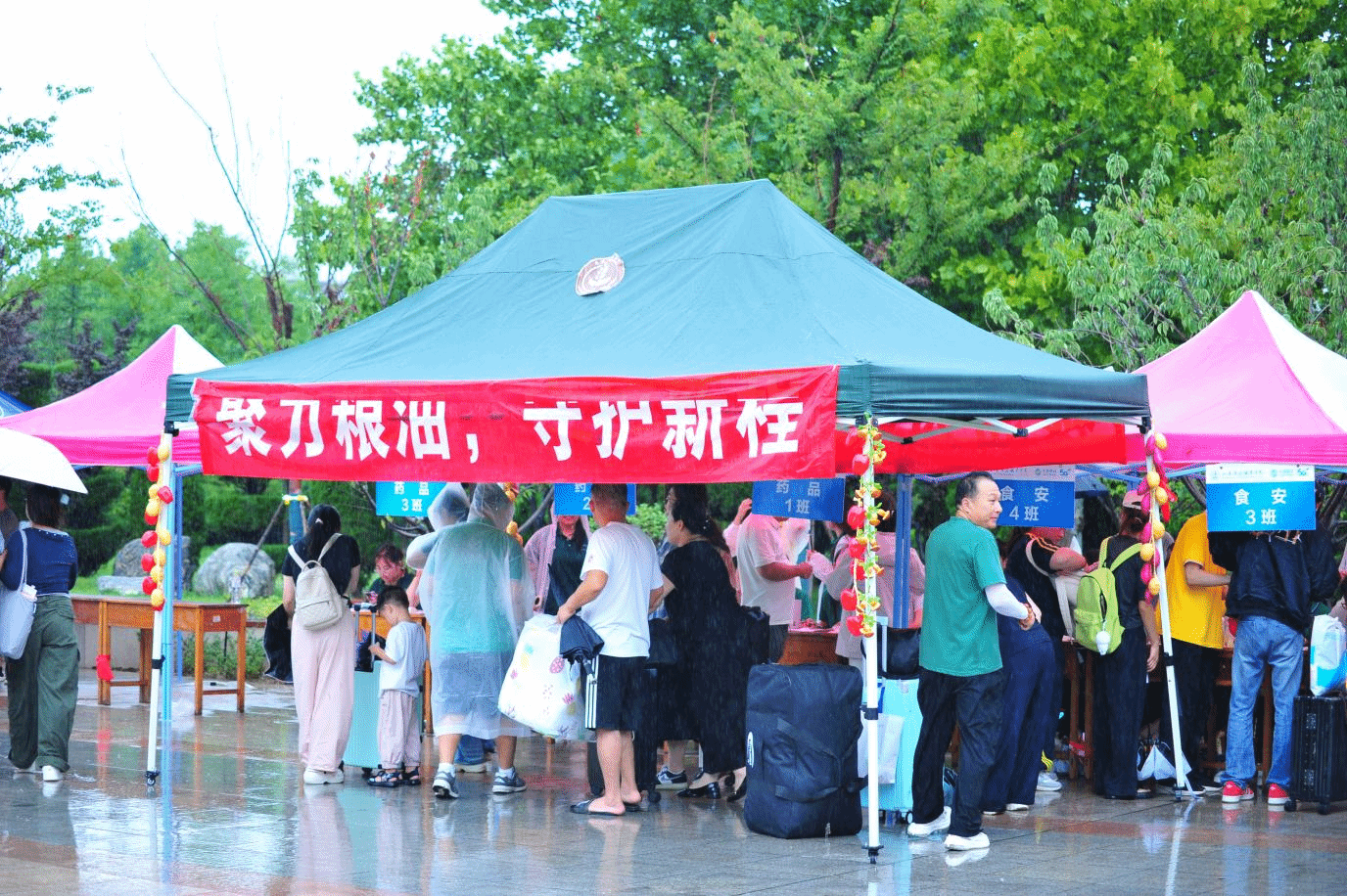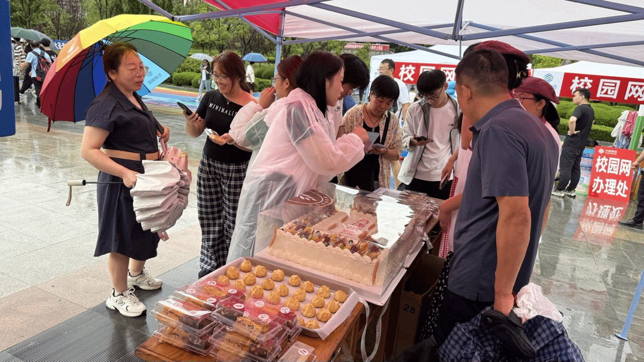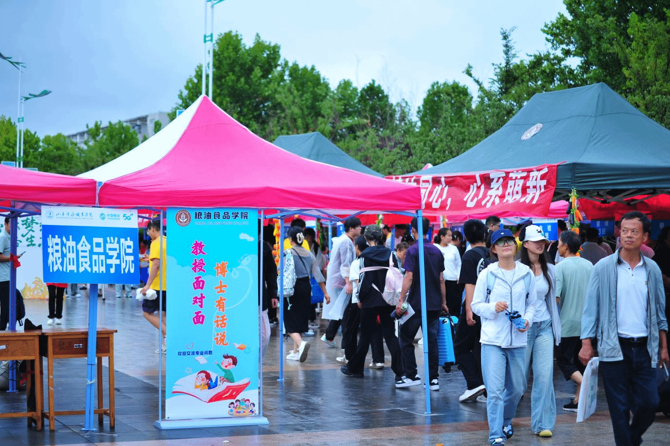 迎新现场,学院的“特色帐篷” 成为亮丽的风景线。帐篷外悬挂着玉米、小麦等农产品装饰,既呼应学院粮食行业特色,又营造出温馨如家的氛围。志愿者们冒雨穿梭在校园入口与报到处之间,热心为新生撑伞、搬运行李,全力保障新生顺利入校。“本来担心下雨不方便,没想到学院早有准备,这顶有‘粮食味’的帐篷太暖心了!”新生家长感慨道。风雨中的坚守与帮扶,不仅展现了学院的服务温度,更让新生初入校园便感受到家一般的关怀。