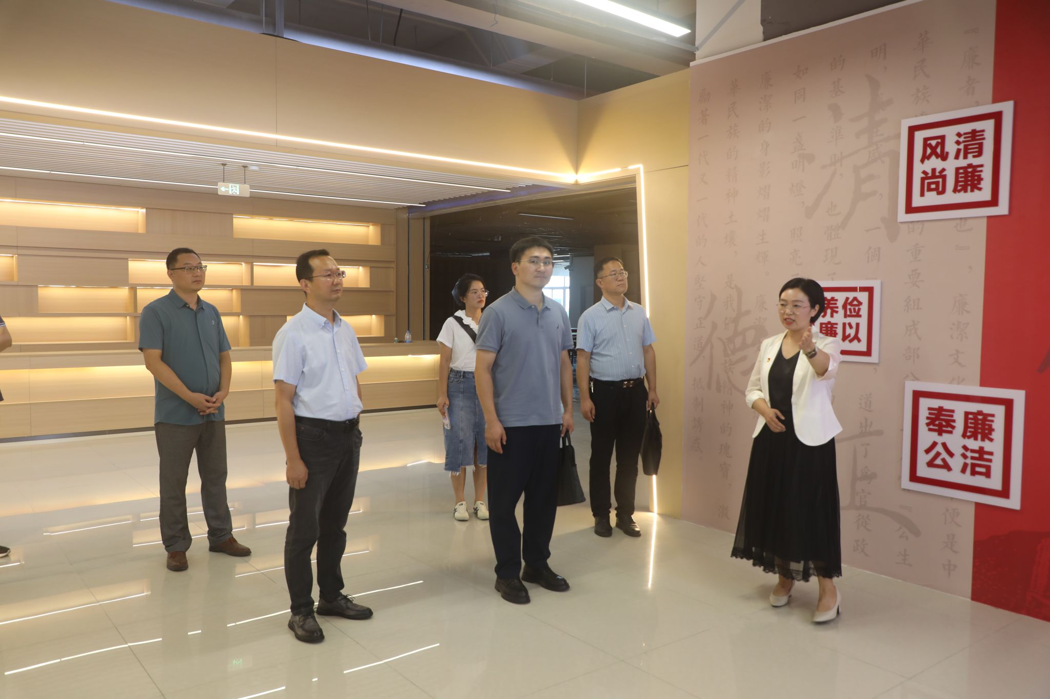 座谈结束后,张林一行在魏才奎等人的陪同下,走进我校“清廉商务”廉洁文化教育展厅。从溯源廉洁文化的历史篇章,到赓续红色基因的实践展区,再到警示育人的案例陈列,一幅幅图文、一段段故事,让大家在沉浸式体验中接受了一次深刻的精神洗礼。