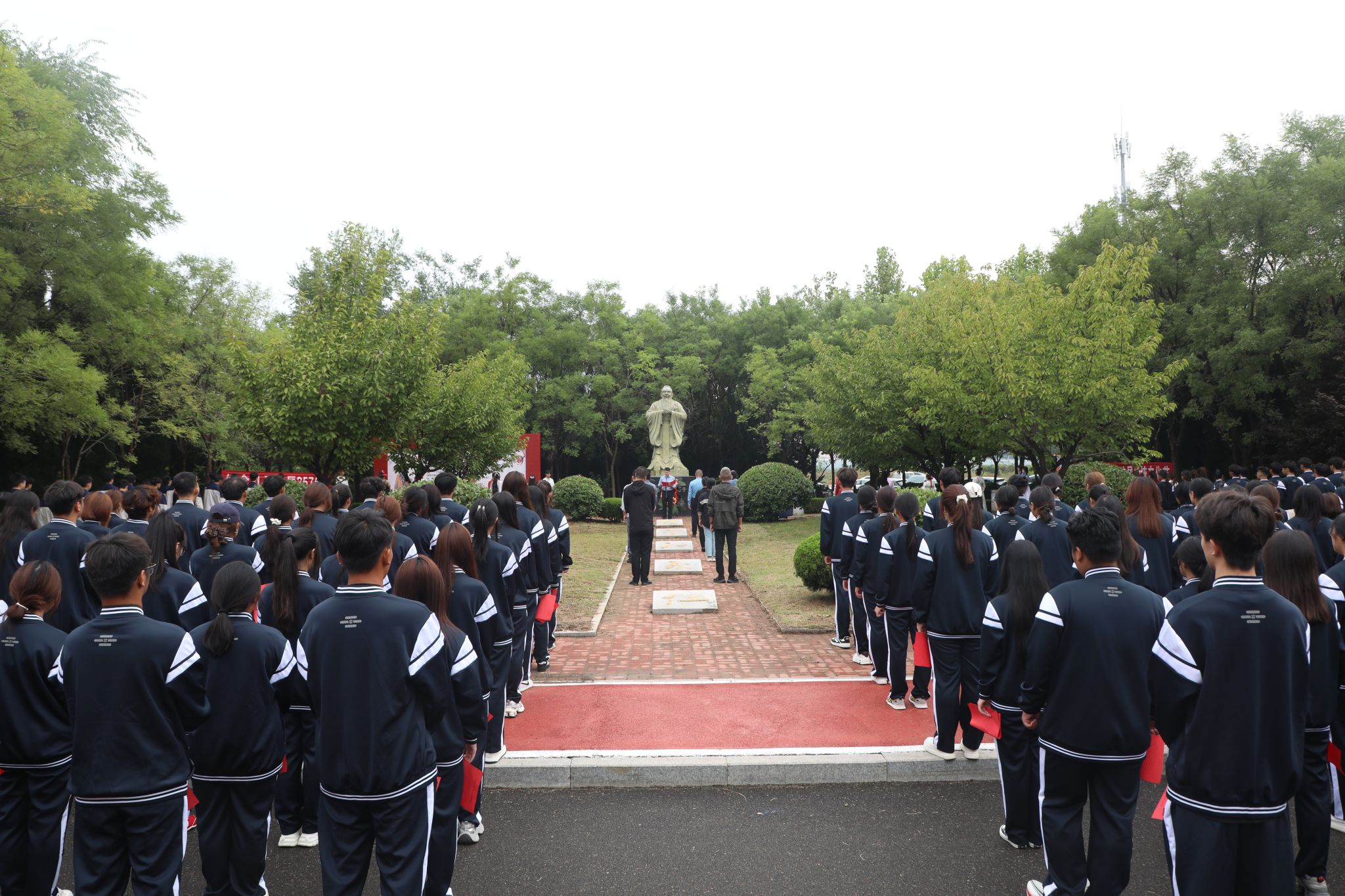师生代表共同完成了传统的“祭孔礼”仪式,依次进行献花、鞠躬礼,以古朴而虔诚的方式缅怀至圣先师,表达对传统文化的敬意。仪式现场,身着汉服的学子昂首挺胸立于孔子雕像前与庄重的礼仪相得益彰,让在场师生深刻感受到传统礼仪文化的厚重与典雅。
