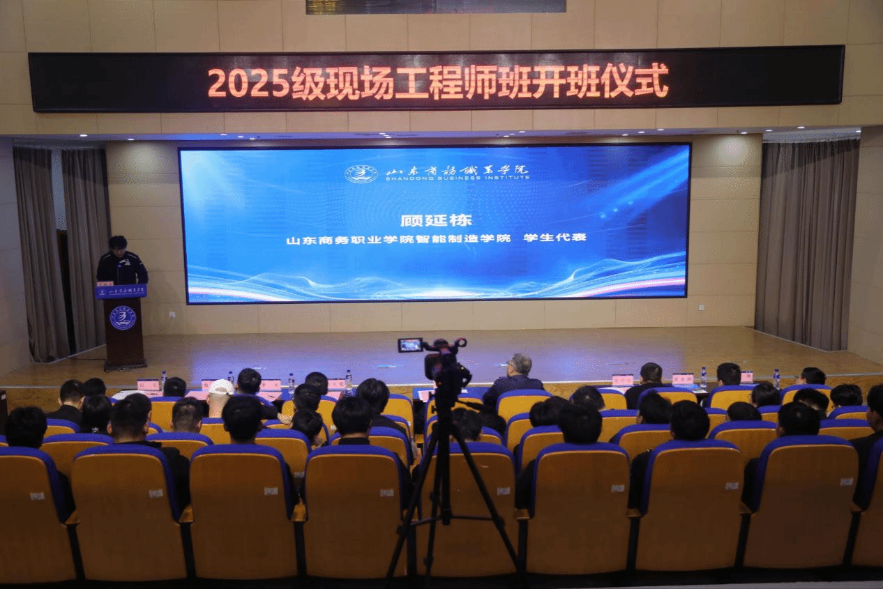 顺捷现场工程师班学生代表顾延栋发言,他满怀自豪地表达了成为现场工程师班一员的荣幸,并向学校、学院及企业郑重承诺:将倍加珍惜此次难得的学习机会,以勤勉态度精进专业技艺,以执着信念淬炼工匠精神,用奋斗书写青春华章,努力成长为符合产业需求、担当时代使命的优秀现场工程师。