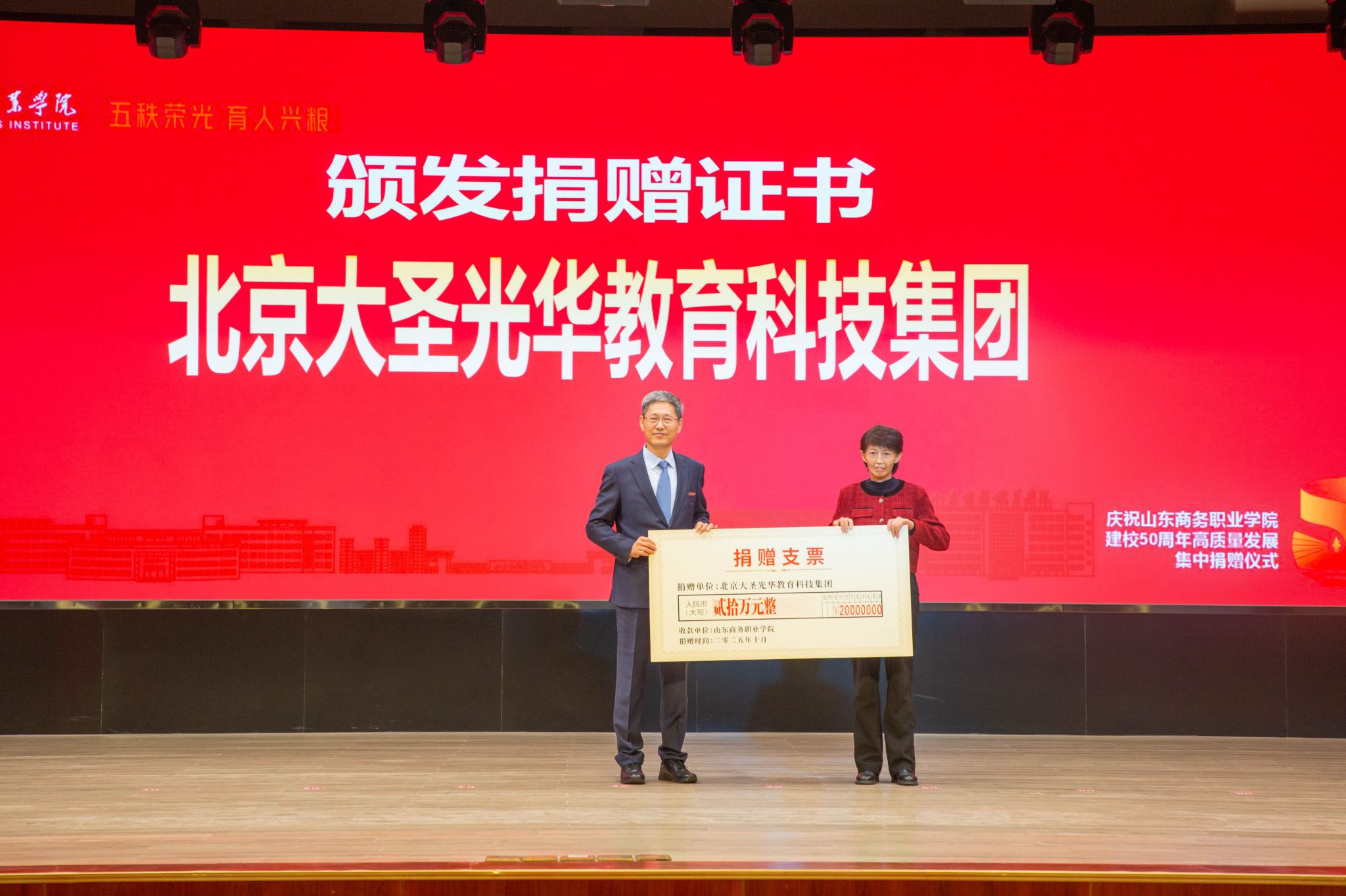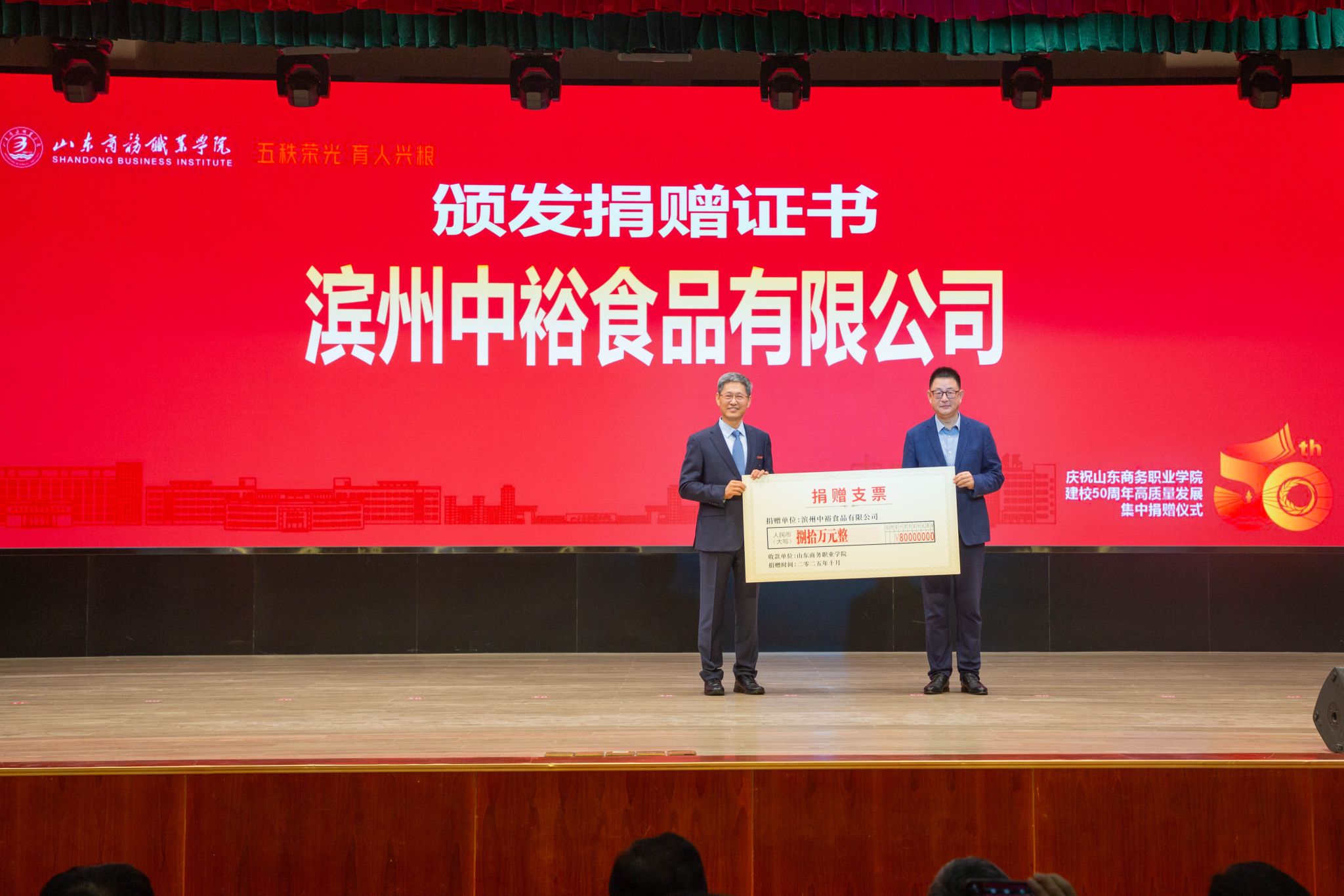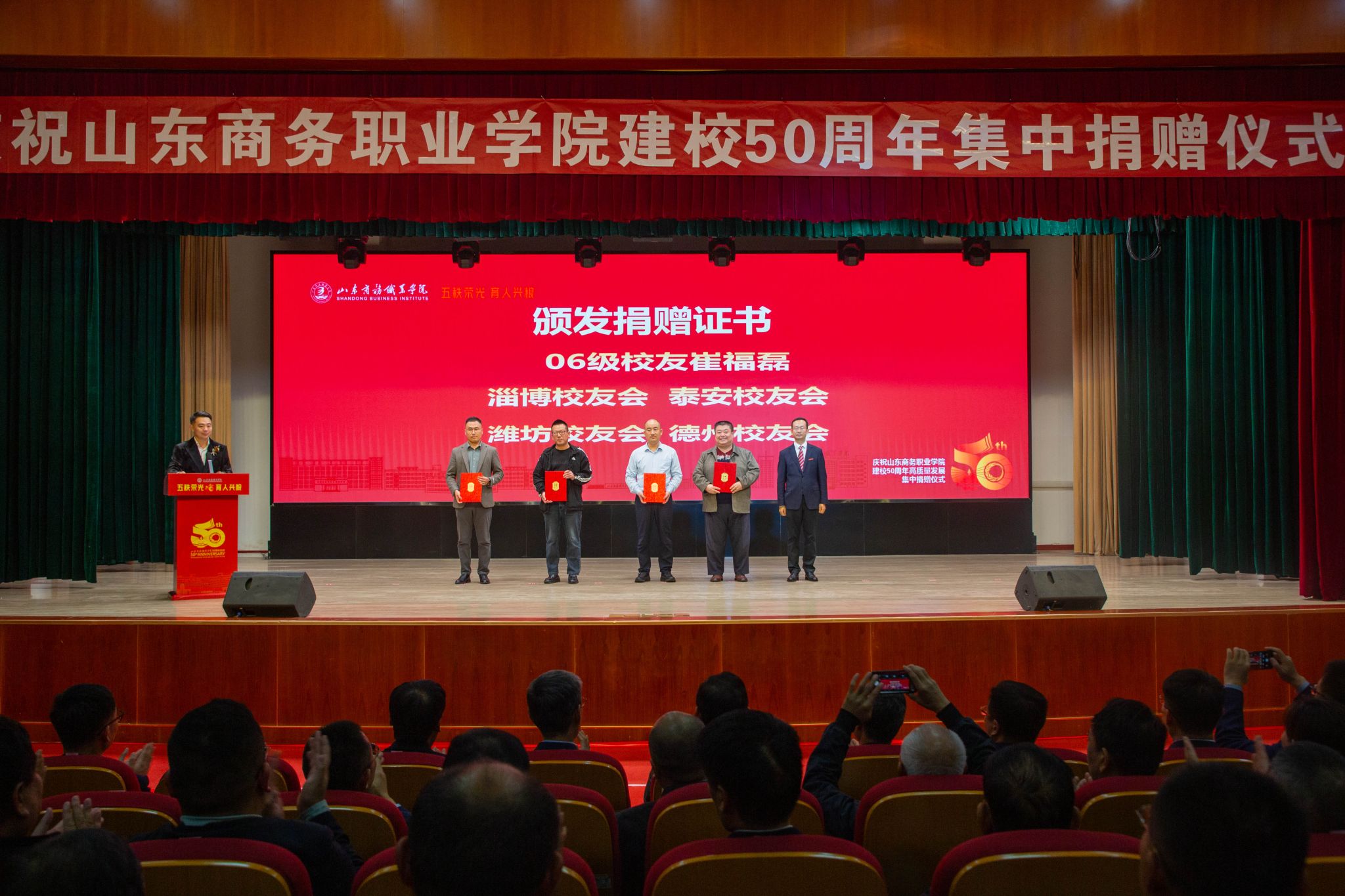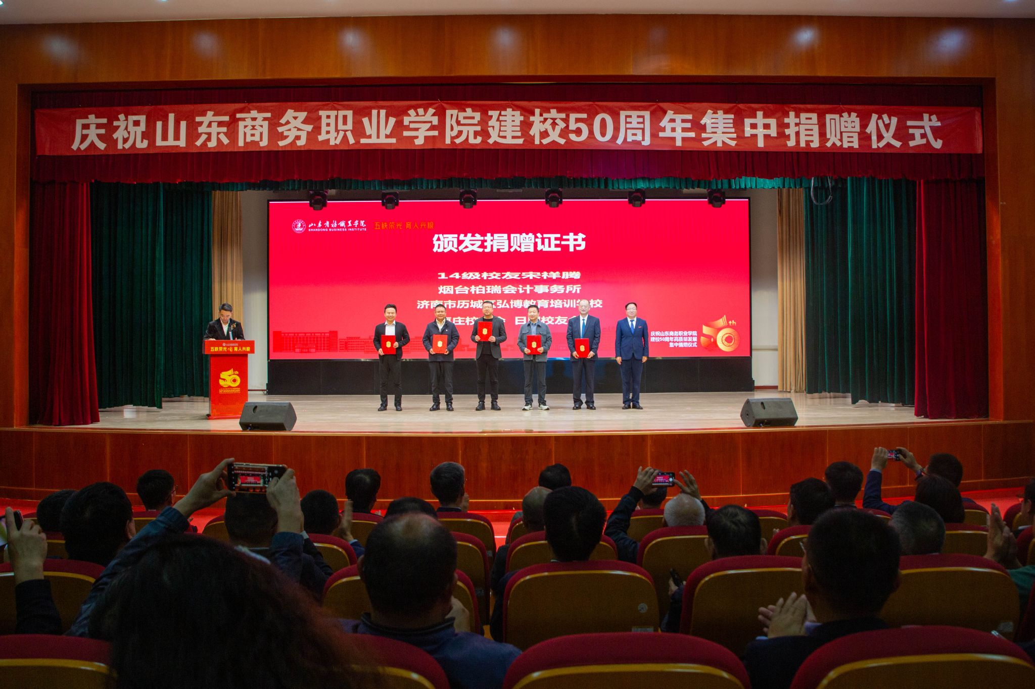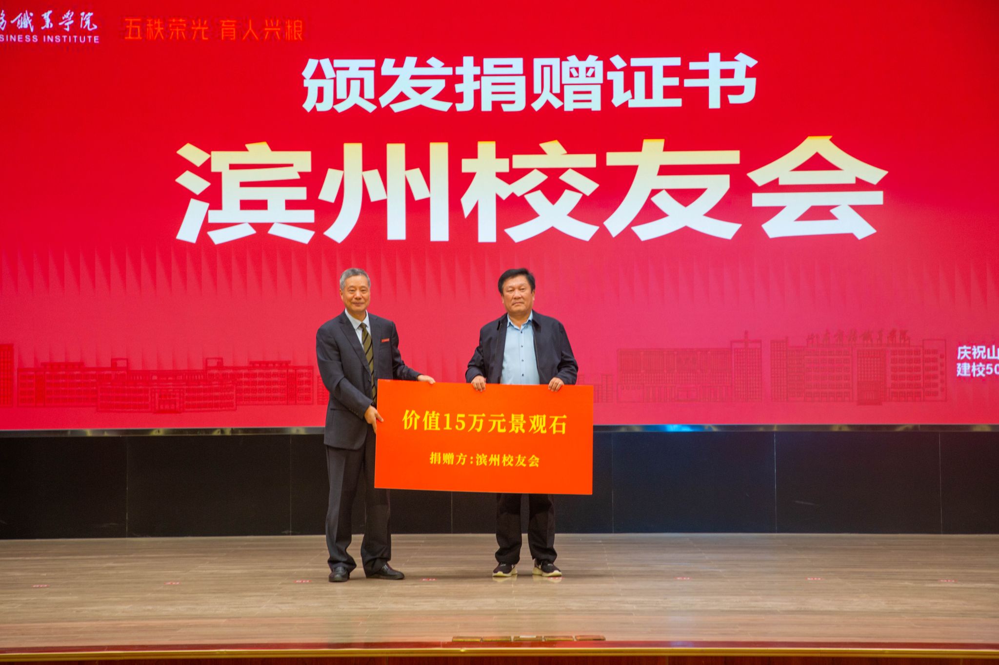 仪式上,滨州中裕食品有限公司、浪潮集团有限公司、北京大圣光华教育科技集团、山东龙仕物业管理有限公司、青岛维良食品有限公司、济南弘博教育培训学校等6家企业,17个地方校友会以及多名校友,向学校捐赠了雕塑、科研实训设备、现金等物资。学校逐一向捐赠方颁发捐赠证书。