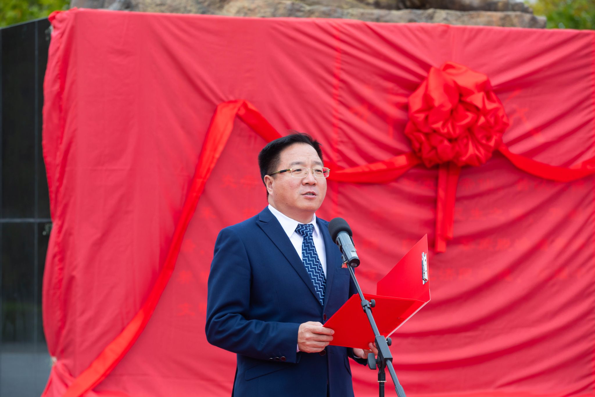 原山东省粮食局党组书记、局长邹大民,山东省粮食和物资储备局党组书记、局长常绪扩,学校党委书记孙云茂,捐赠方代表吕学彬为雕像揭幕。